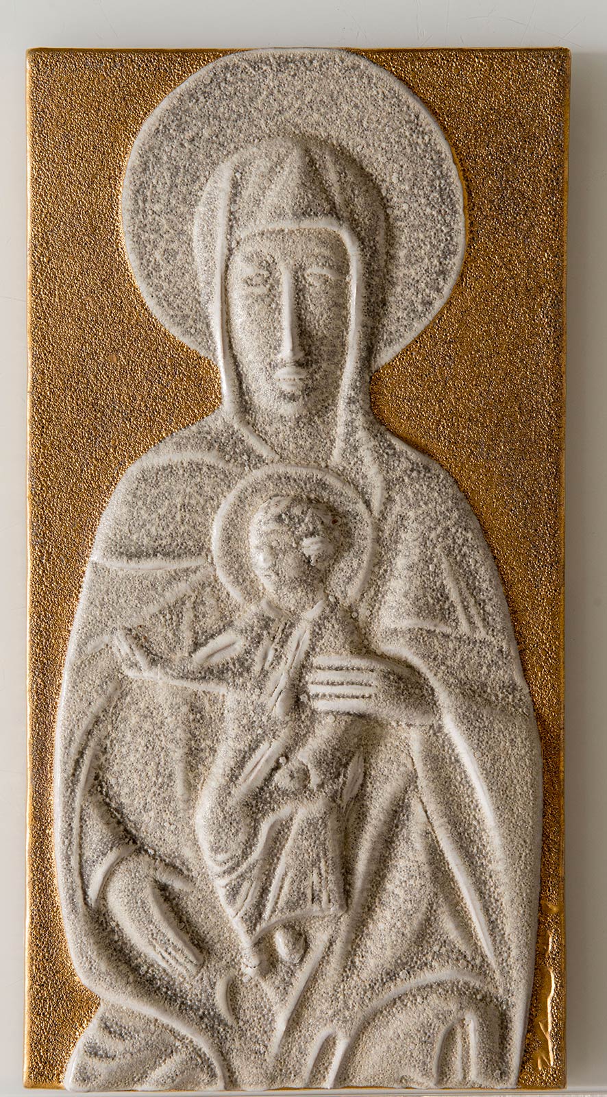 Carlo Zauli (Faenza1926 - 2002), “Madonna con Bambino”, Anni ‘70. Formella in ceramica con fondo dorato, firmata alla base Zauli, H cm 45x23.5