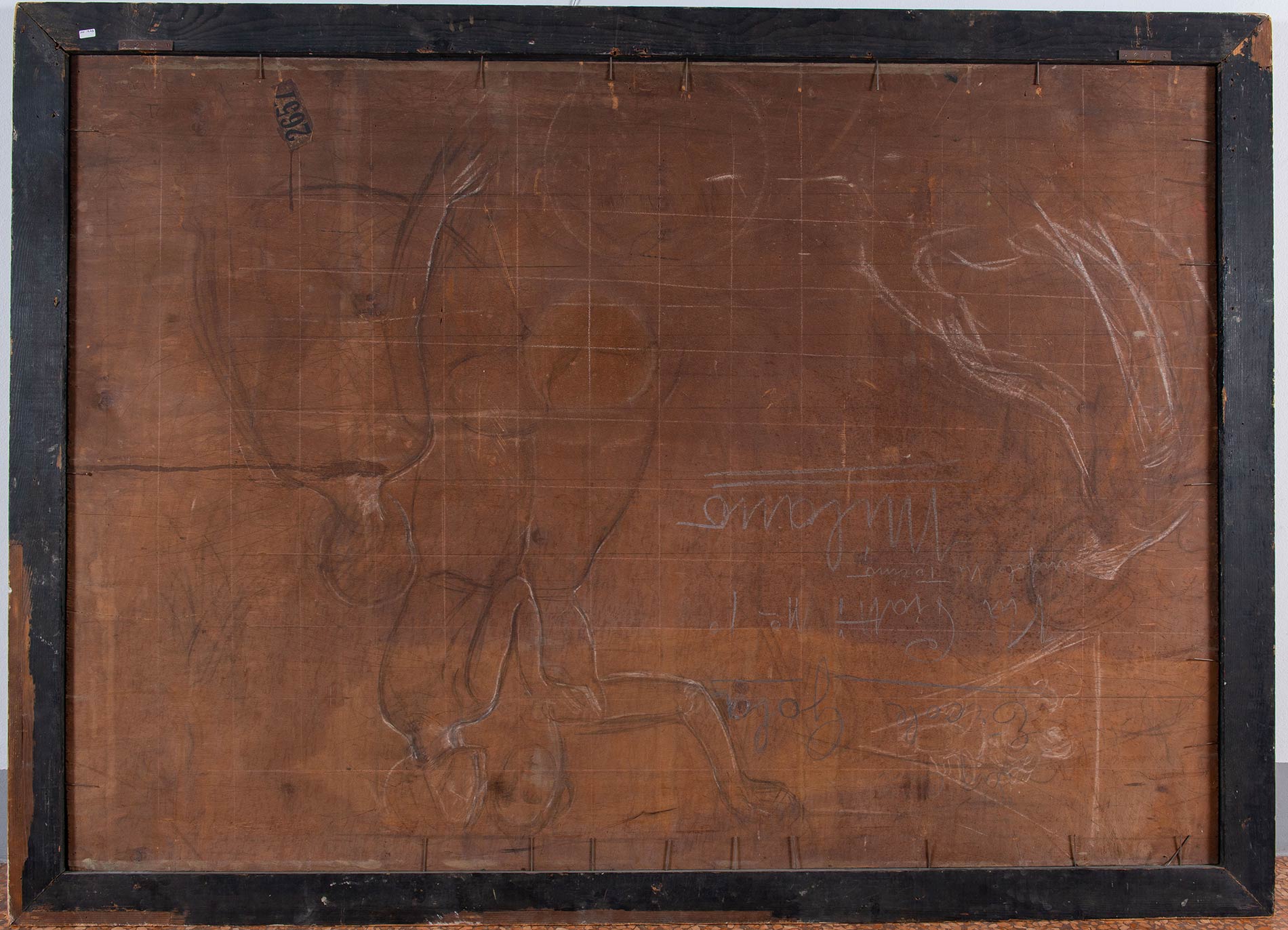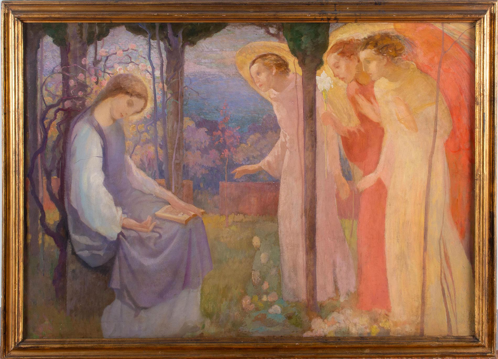 Mario Micheletti (Balzola 1892 - San Maurizio Canavese 1975), “Annunciazione”. Olio su tavola, firmato al retro Micheletti Mario Torino, al retro iscrizione, bozzetto e etichetta con numero 2657, H cm 122x173.5 Provenienza: Ercole Golia – Milano.