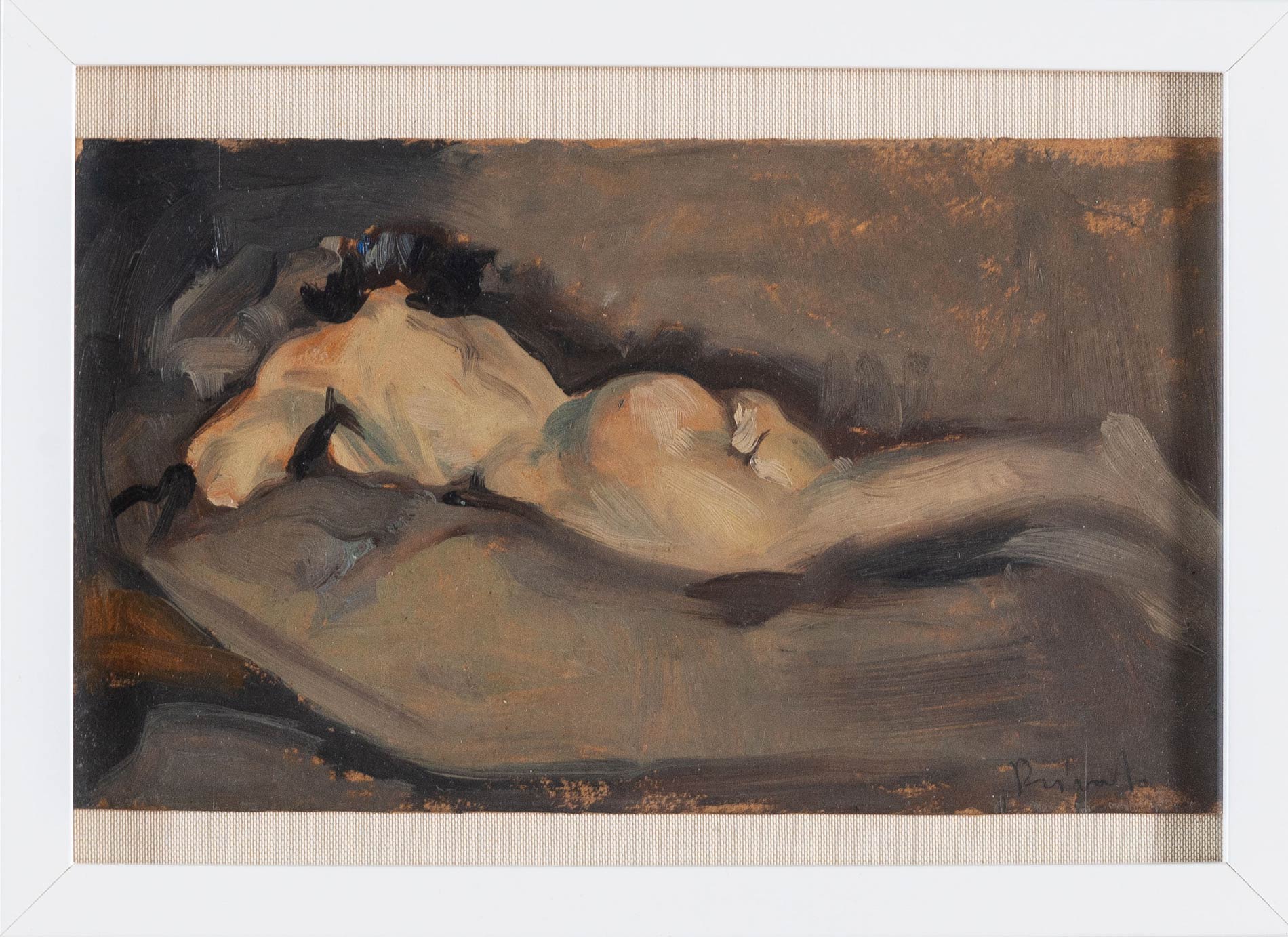 Cosimo Privato (Venezia 1899 - 1971), “Nudo disteso di donna”. Olio su cartone, firmato in basso a destra Privato, H cm 17x29.5