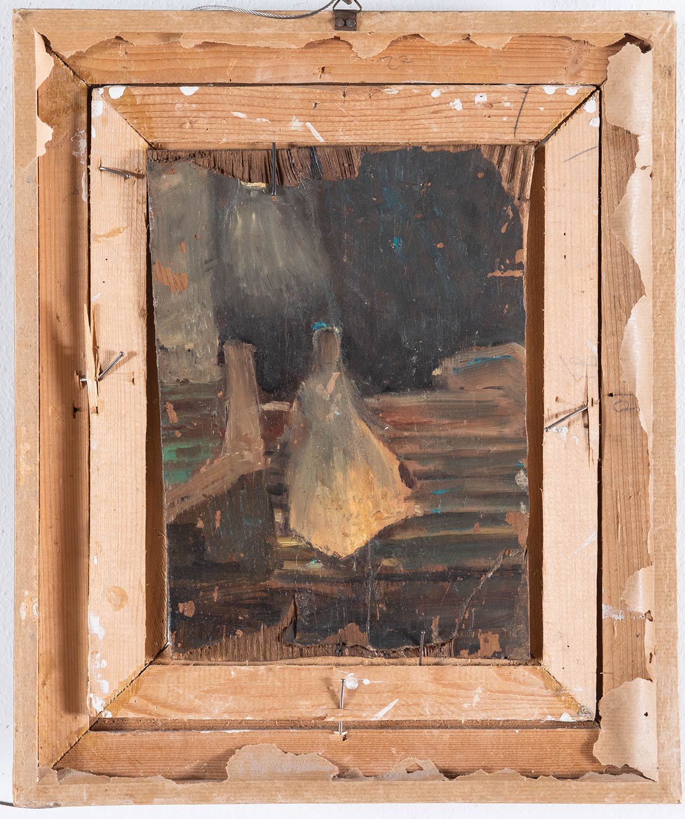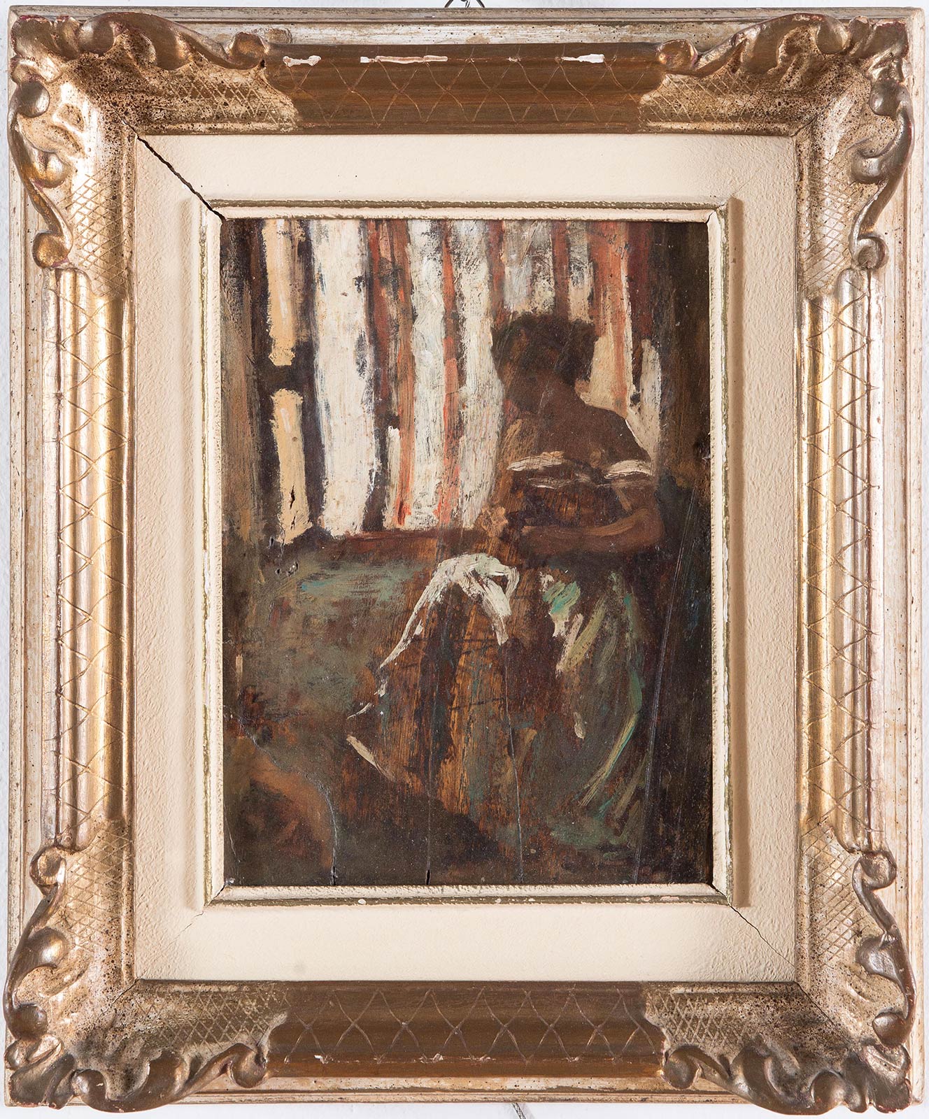 Mario Cavaglieri (Rovigo 1887 - Peyloubère par-Pavie 1969), “Donna in un interno”, 1910. Olio su tavola, H cm 24x18 Al retro schizzo di figura femminile su un ponte (Venezia?). Bibliografia di riferimento: Opera pubblicata in ‘Cavaglieri - catalogo ragionato dei dipinti’ - Viviane Vareilles,, Vol 2, p. 42, Umberto Allemandi & C.; ‘Mario Cavaglieri nella pittura del ‘900’ - M. Chiregatti, L. Zerbinati,, ed. Minelliana.