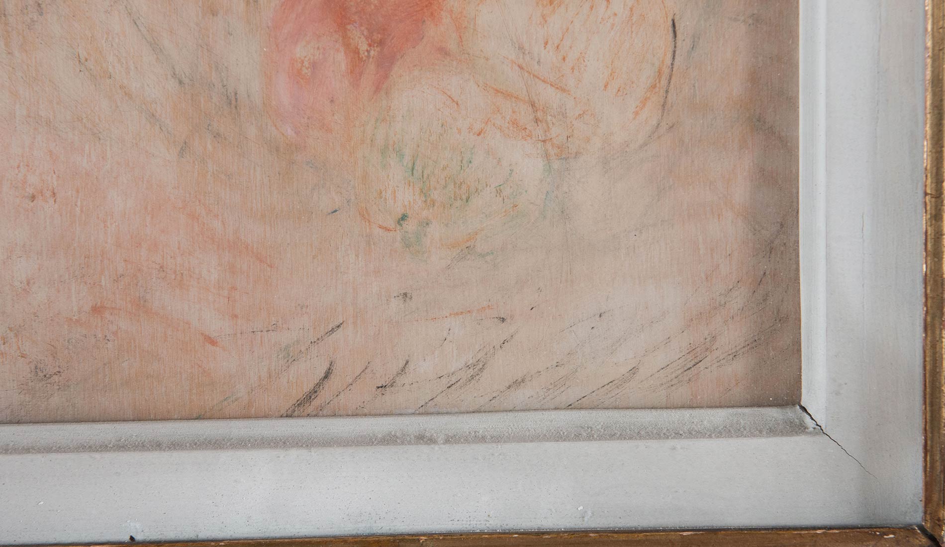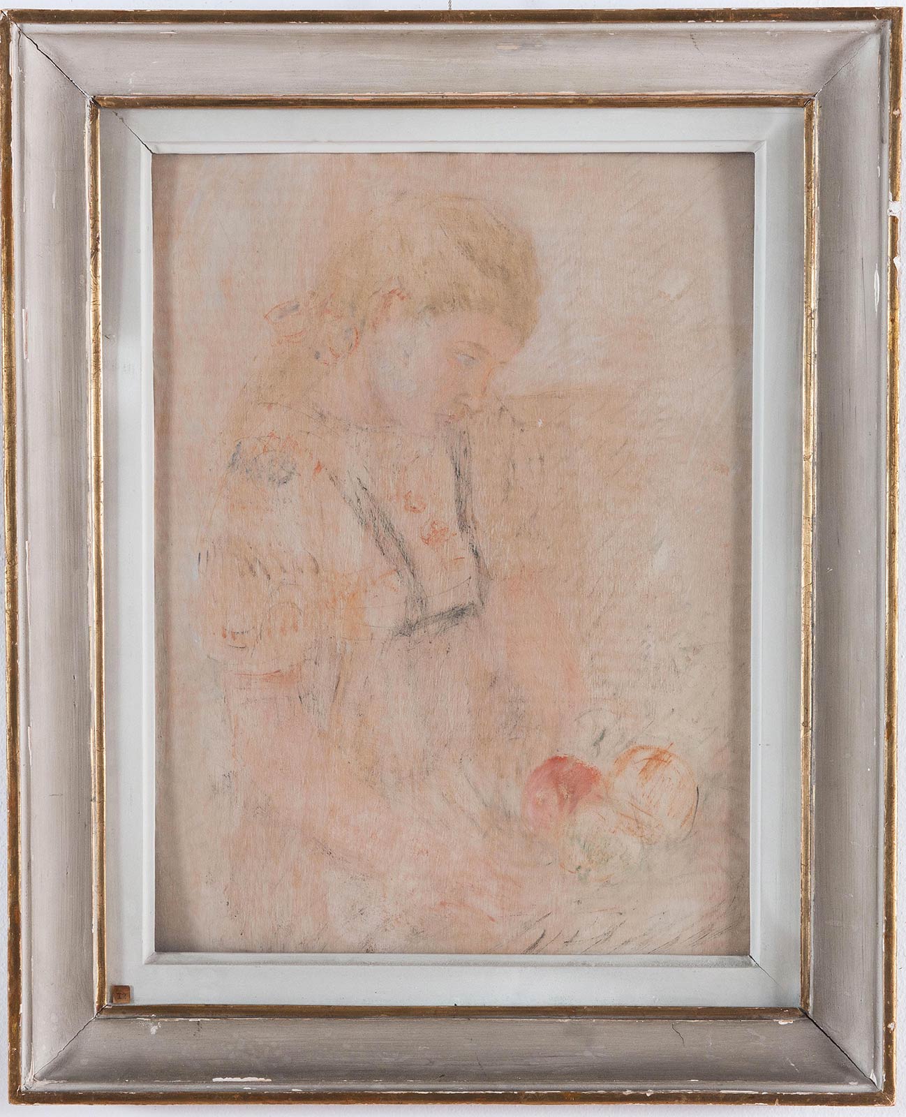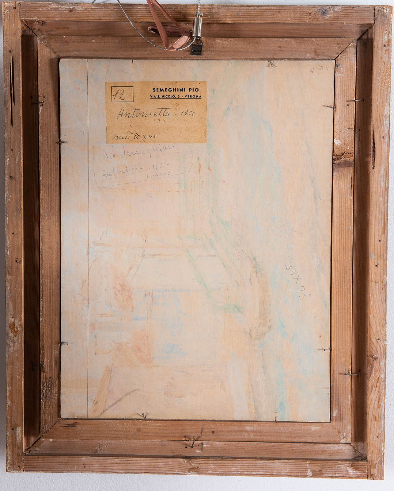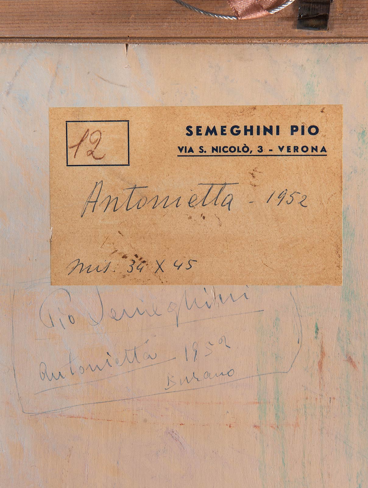Pio Semeghini (Quistello 1878 - Verona 1964), “Antonietta”, 1952. Olio su compensato, firmato in basso a destra Semeghini, firmato, datato e titolato al retro ‘Pio Semeghini/Antonietta 1952/Burano’, H cm 45x34 Al retro etichetta Pio Semeghini e tracce di un paesaggio marino con scritte varie, tra cui il titolo e la data.
