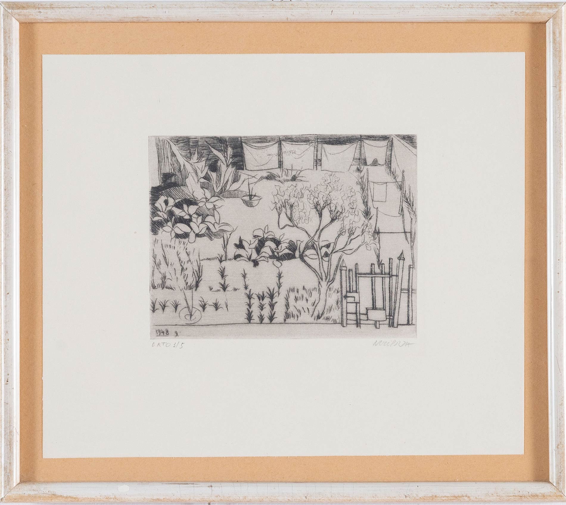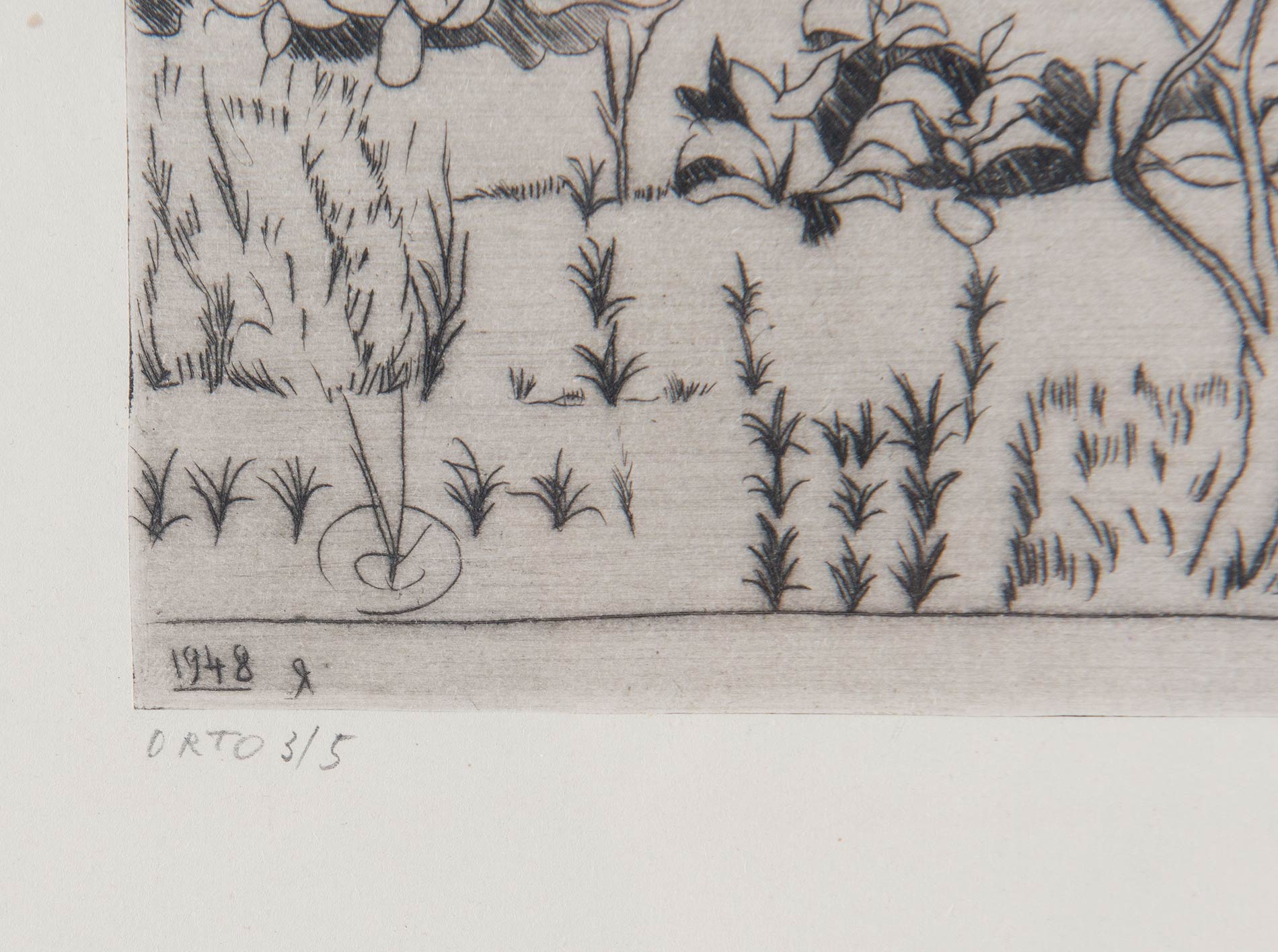 Neri Pozza (Vicenza 1912 - 1988), “Orto”, 1948. Puntasecca, firmata in basso a destra Neri Pozza, titolo e numero di tiratura in basso a sinistra ‘Orto 3/5’, H cm 12x15.7 Bibliografia di riferimento: ‘Incisioni di Neri Pozza 1935-1985’, Neri Pozza Editore: Vicenza, 1987, n.21.