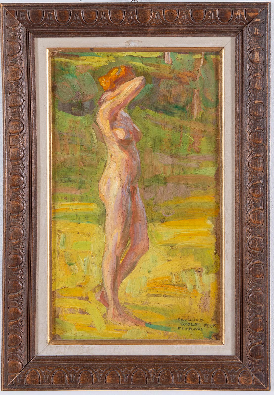 Teodoro Wolf Ferrari (Venezia 1878 - San Zenone degli Ezzelini 1945), “Nudo di Donna”, 1912. Olio su cartone, firmato e datato in basso a destra Teodoro Wolf Ferrari 1912, H cm 47x27 Opera accompagnata da autentica firmata dalla Dottoressa Federica Luser – Trieste, 7 Aprile 2009.