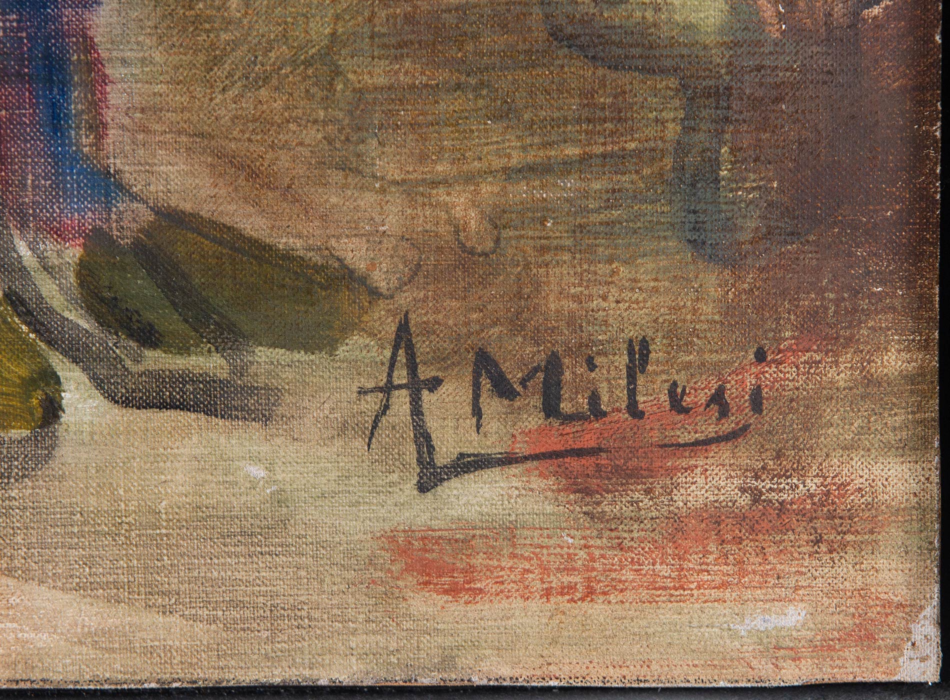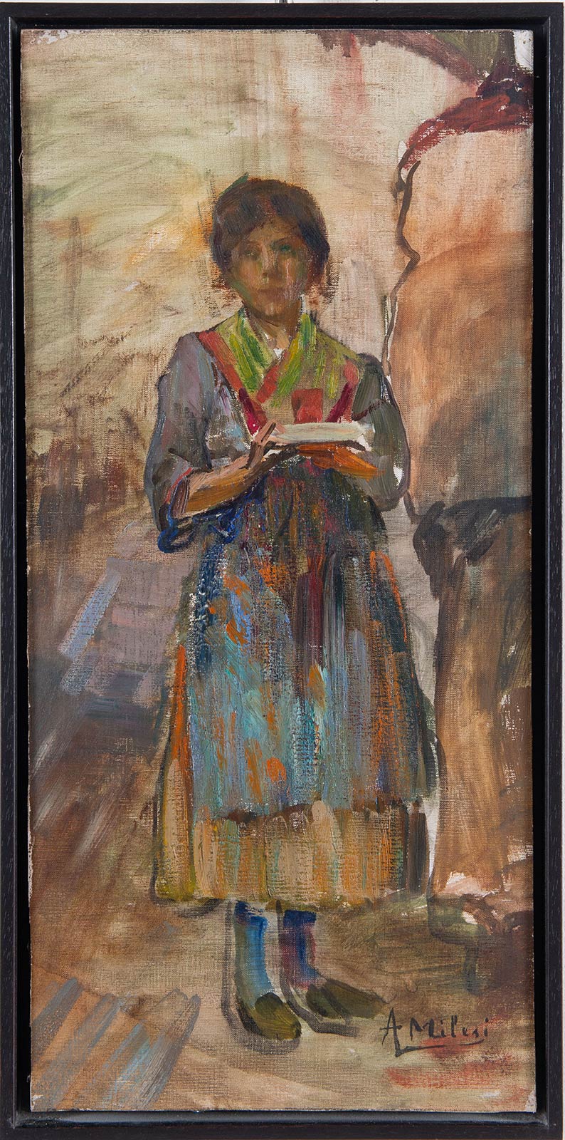 Alessandro Milesi (Venezia 1856 - 1945), “Bambina con vassoio”. Olio su cartone telato, firmato in basso a destra A. Milesi, H cm 64x30