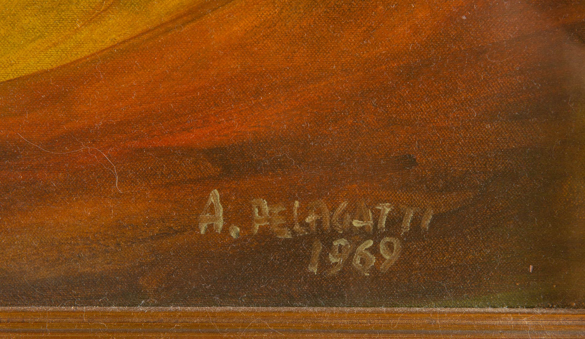 Alberto Pelagatti (San Giorgio di Piano 1927), “Paesaggio”, 1969. Olio su tela, firmato e datato in basso a destra A. Pelagatti 1969, H cm 59x68
