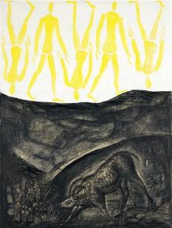 Roberto Barni Pistoia 1939 Passi gialli, 1999 Olio e tecnica mista su tela, cm. 79,8x60 Firma, data e titolo al verso sulla tela: Roberto Barni / 1999 / Passi gialli. Foto autenticata dall'artista.