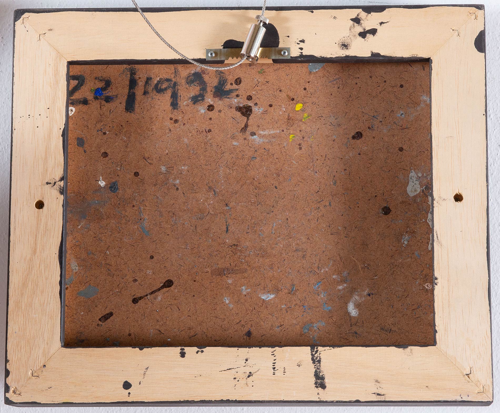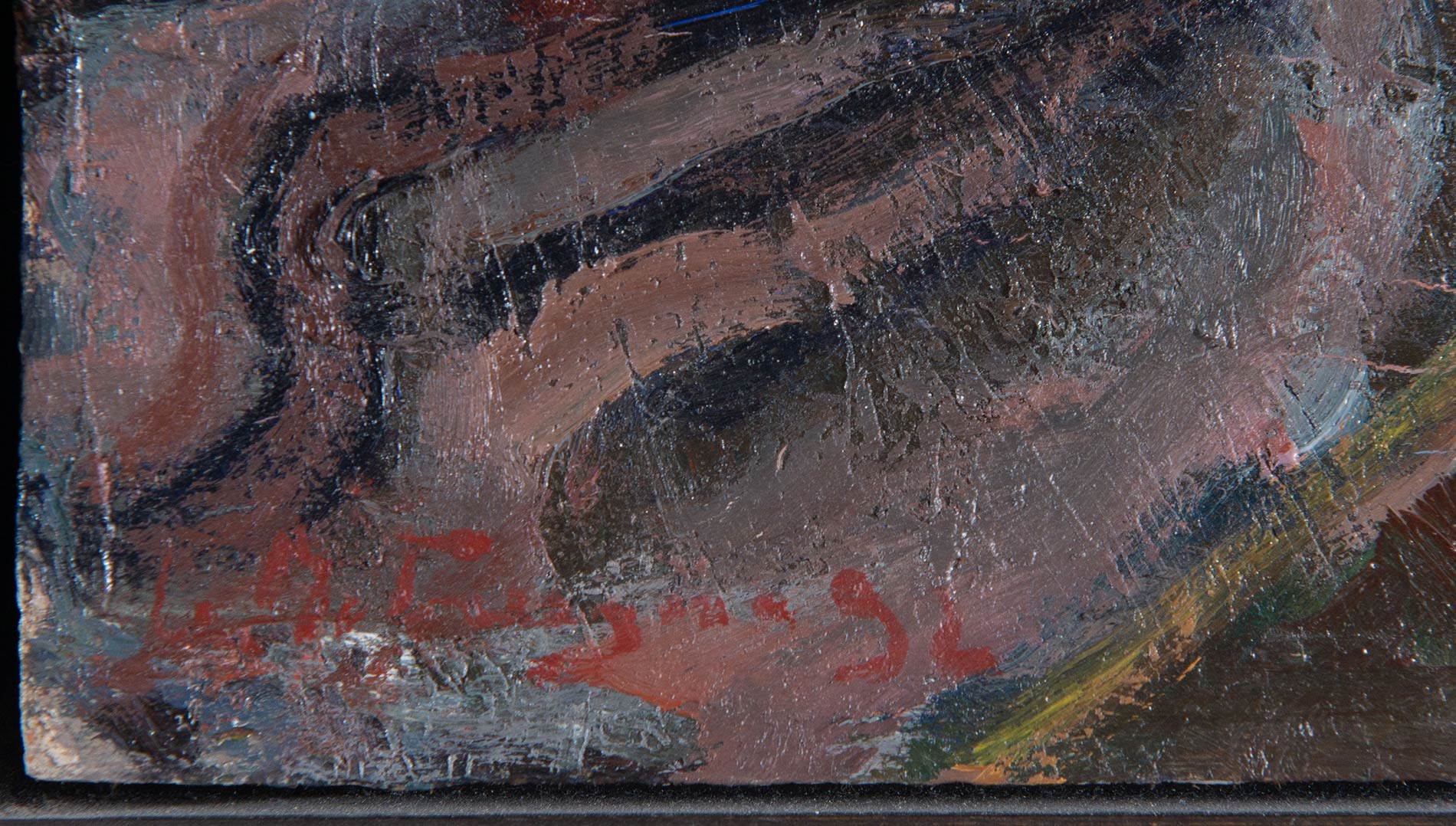Livio Mitrugno (Roncone 1942), “Paesaggio”, 1992. Olio su cartone, firmato e datato in basso a sinistra L. Mitrugno 92, al retro data 1992, H cm 25x30