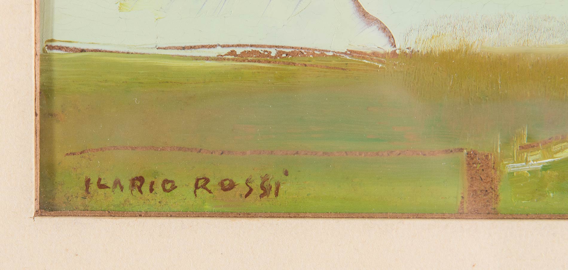 Ilario Rossi (Bologna 1911 - 1994), “Montagna e prato verde”. Olio su masonite, firmato in basso a sinistra Ilario Rossi, al retro iscrizione per autentica ‘Olio autentico/Ilario Rossi’, H cm 13.5x19.5