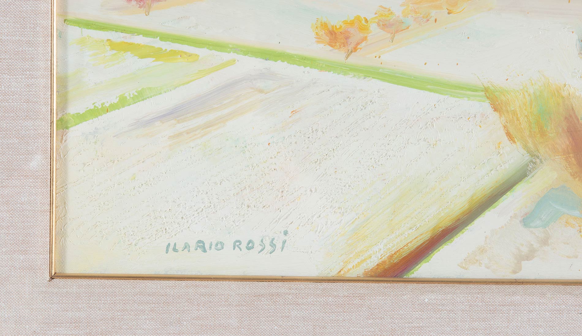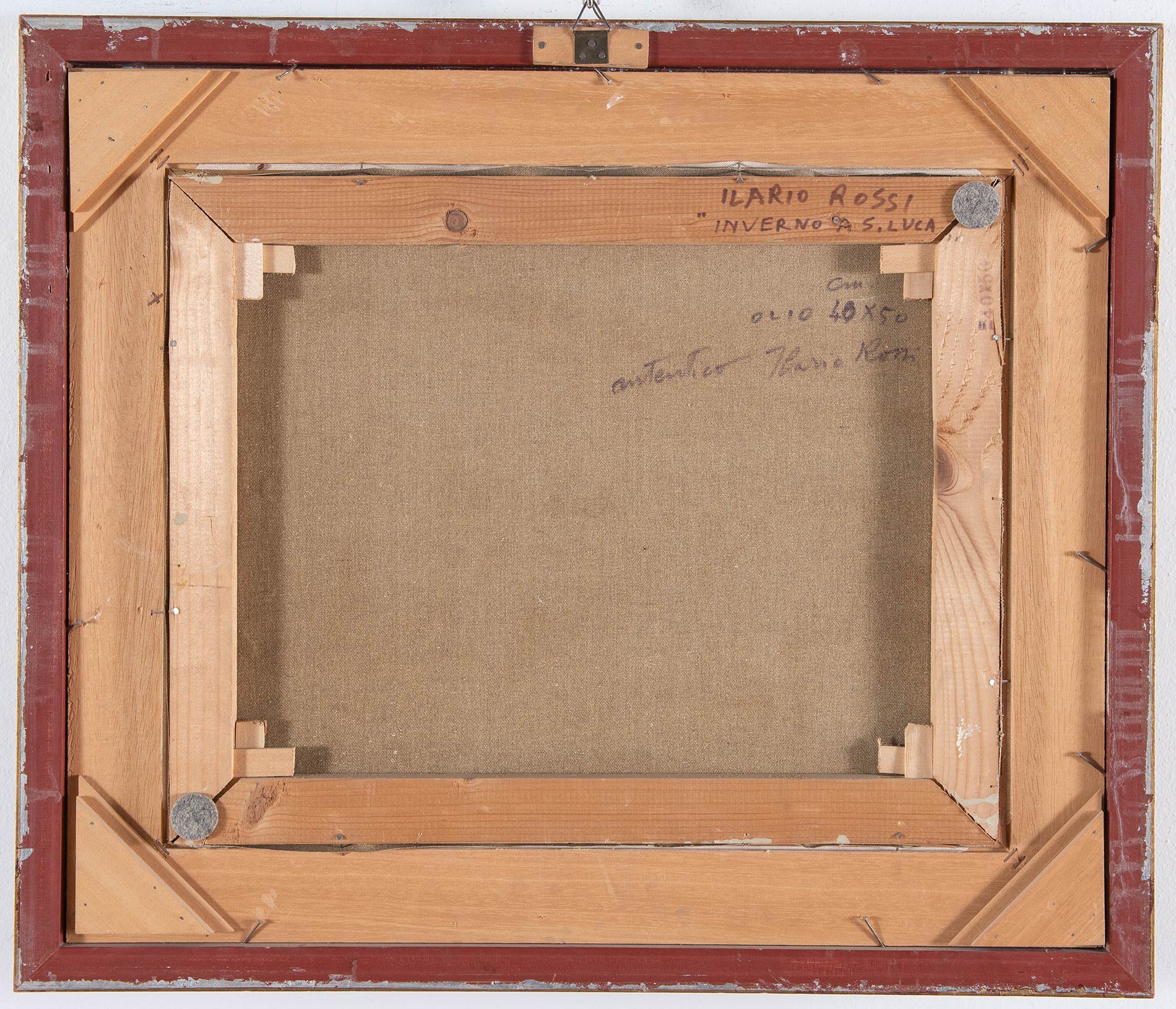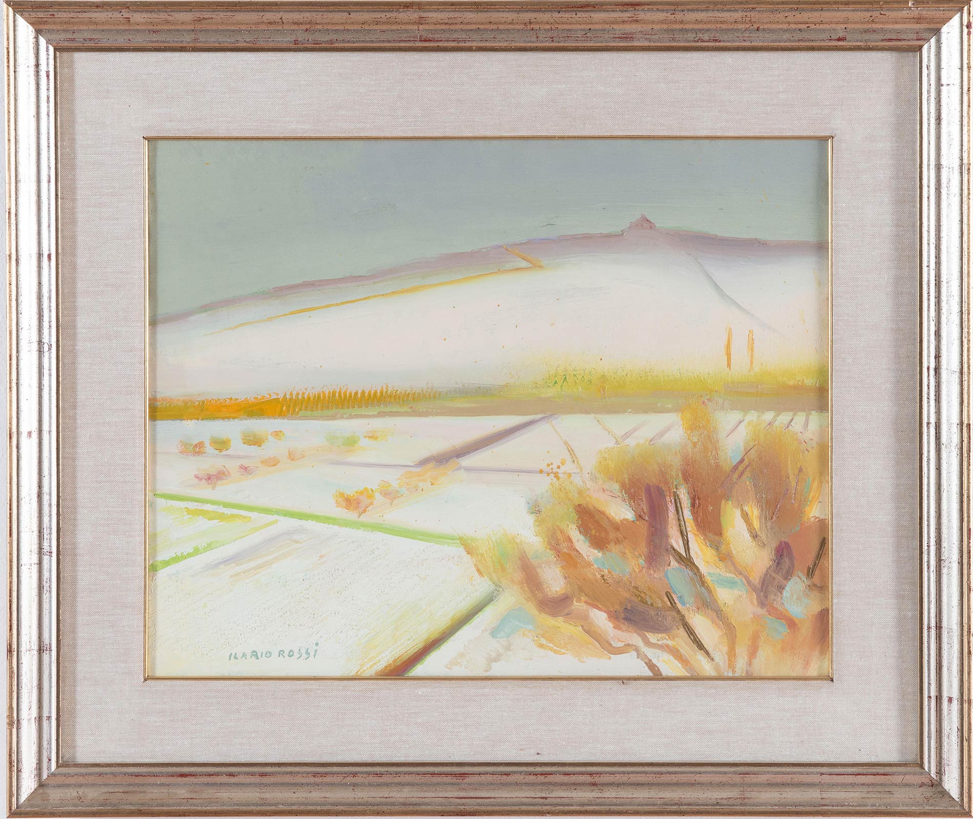 Ilario Rossi (Bologna 1911 - 1994), “Inverno a San Luca”. Olio su tela, firmato in basso a sinistra, al retro titolo, firme e autentica ‘Ilario Rossi/Inverno a S. Luca, autentico’, H cm 40x50
