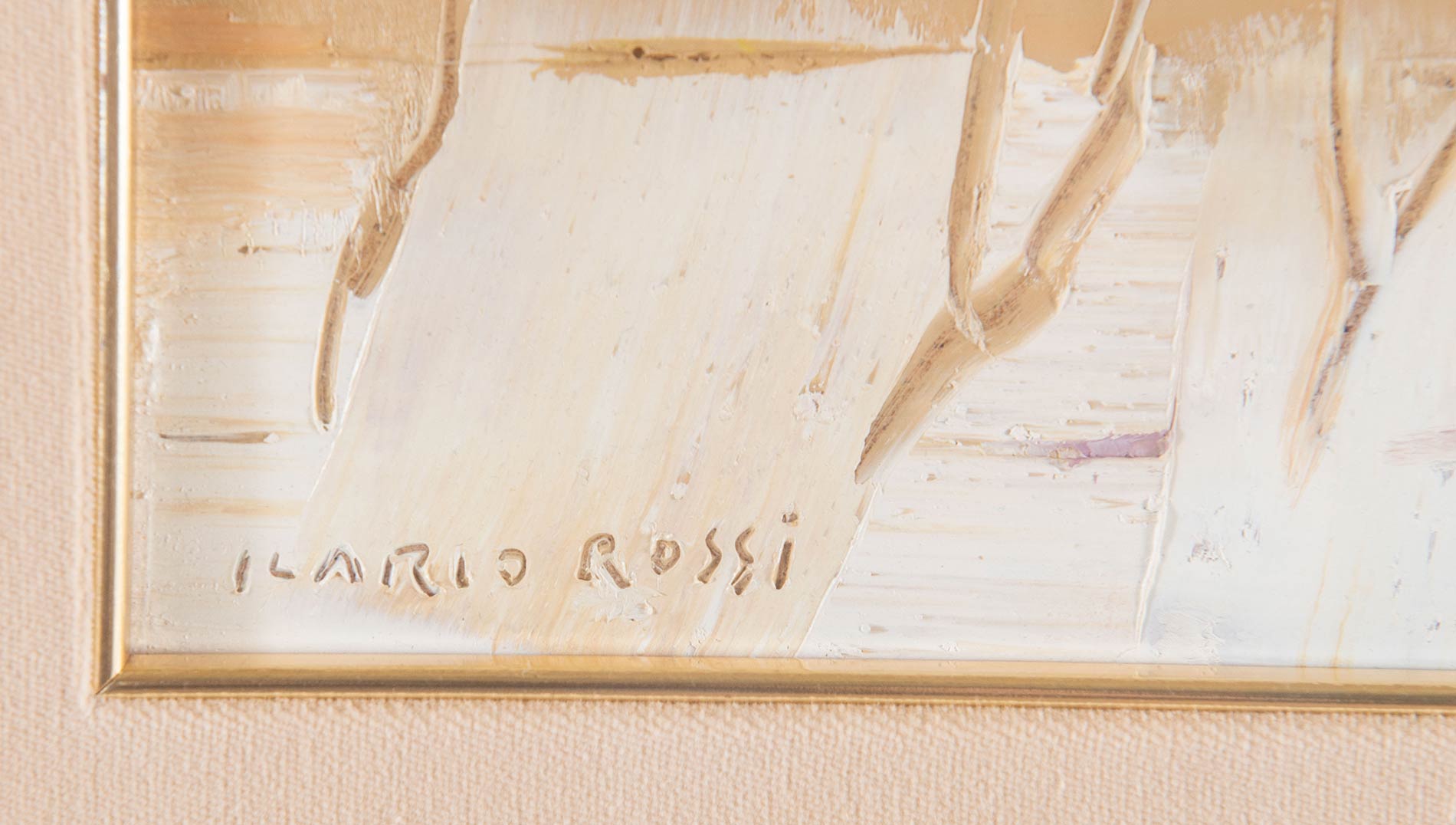 Ilario Rossi (Bologna 1911 - 1994), “Bianco monte al tramonto”. Olio su cartone telato, firmato in basso a sinistra, al retro iscrizione per autentica ‘Olio autentico/Ilario Rossi’, H cm 18x27