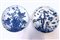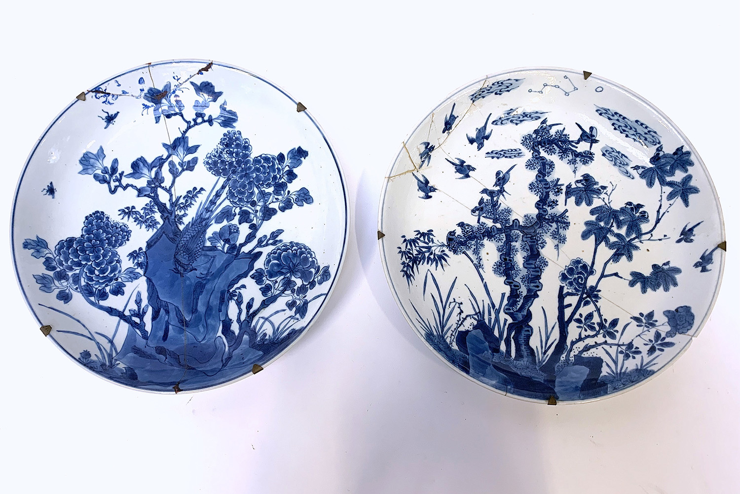Due piatti in porcellana bianca e blu decorati con passerotti in volo montati su sostegno (d. cm 27) (gravi difetti e restauri)