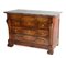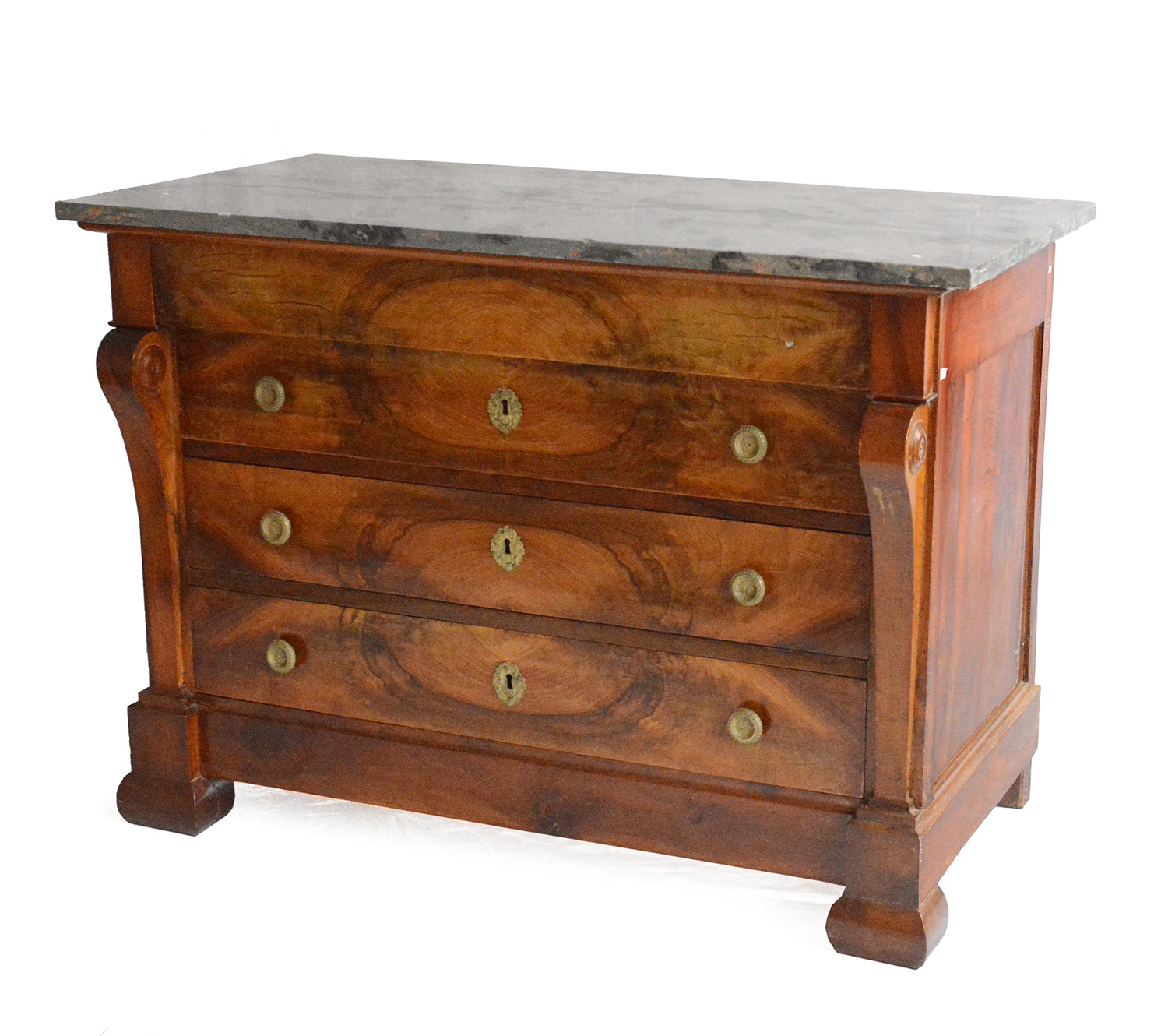 Comò a quattro cassetti lastronati in piuma, montanti sagomati, piedi squadrati. Piano in marmo. Secolo XIX (cm 133,5x96x63) (difetti e restauri)