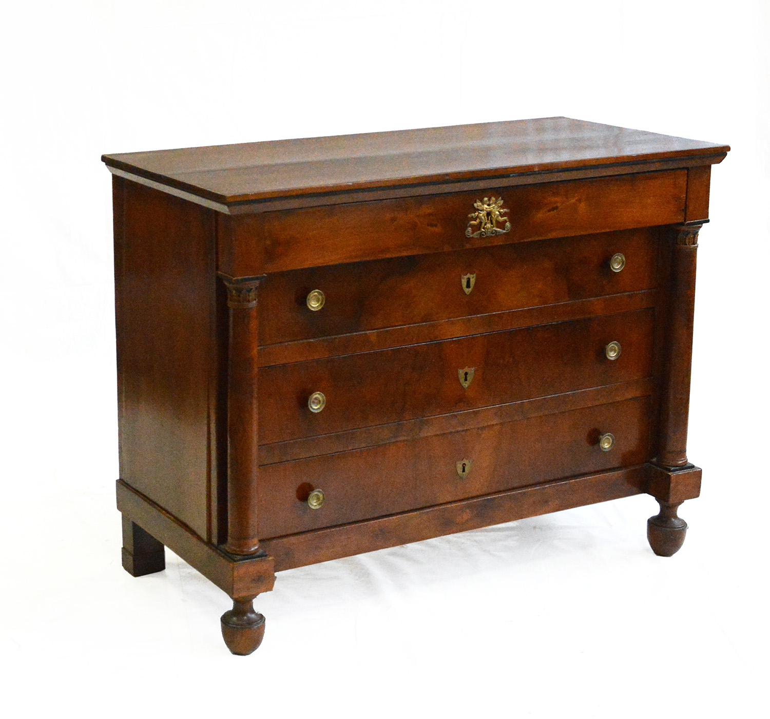 Comò lastronato a quattro cassetti con montanti a colonne tornite decorate da capitelli dorati. Cassetto sottopiano decorato da fregio in bronzo con Amorini. Piedi torniti. Secolo XIX (cm 113x88x54) (difetti e restauri)