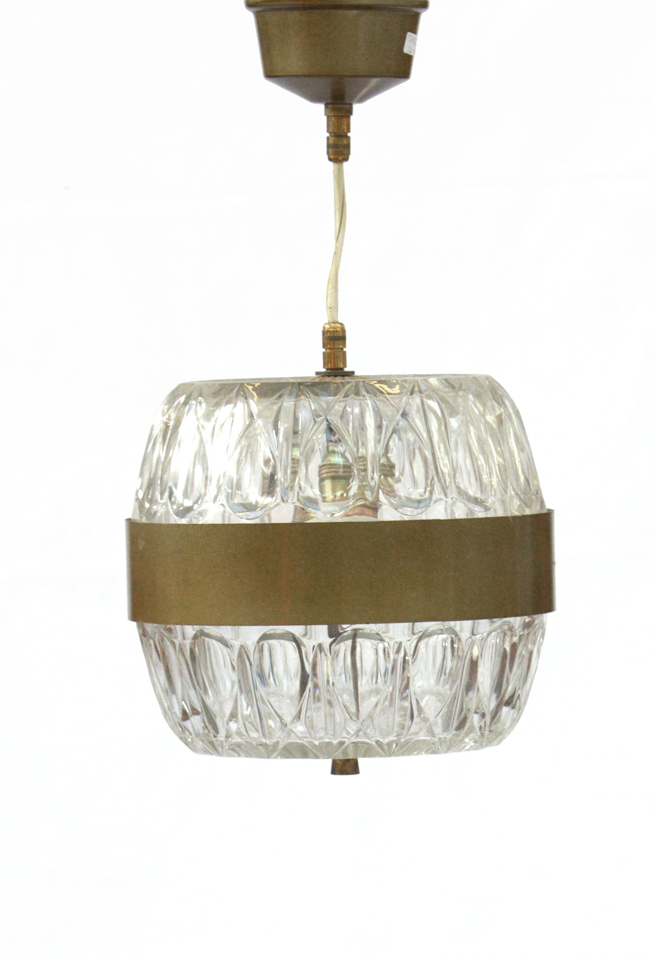 Lampada a sospensione con paralume in vetro stampato e fascia centrale in metallo ottonato. Italia, anni '60. (h cm 45) (lievi difetti)