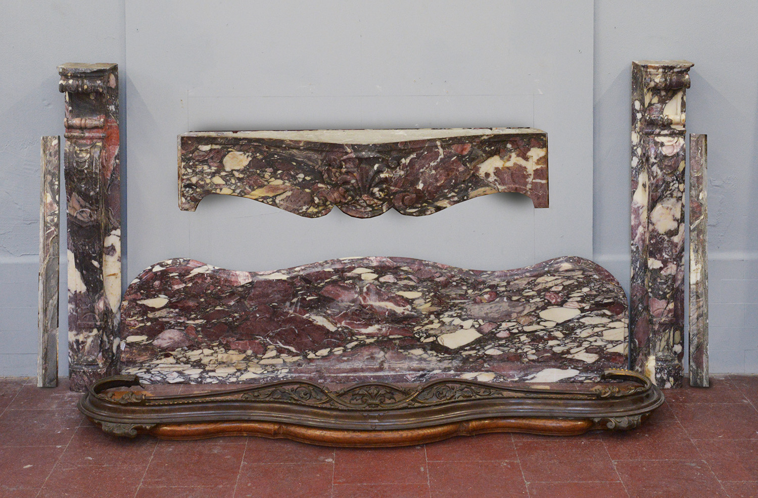 Camino di forma mossa in calacatta viola, fascia centrata da cartella con giglio. Secolo XIX (cm 160x100x32) Unito ad una ringhiera di forma analoga