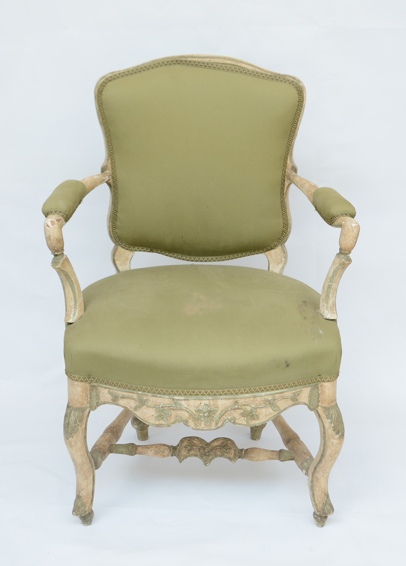 Poltroncina in legno laccato con braccioli e schienale mossi, gambe e fascia intagliate a fiori e foglie. Francia, fine secolo XVIII (difetti e restauri)
