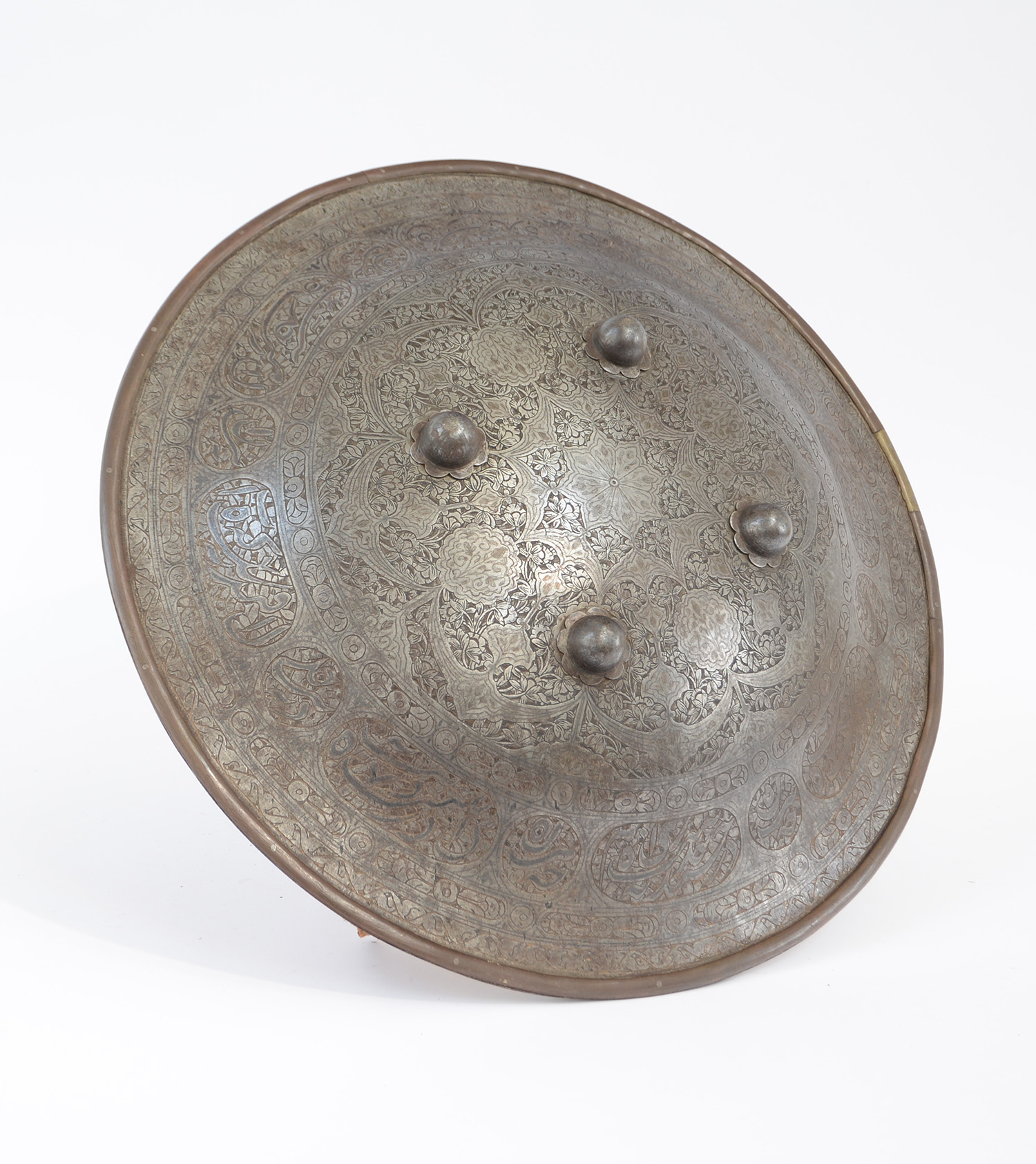 Scudo islamico in ferro inciso all'acido con motivi floreali e versetti coranic
