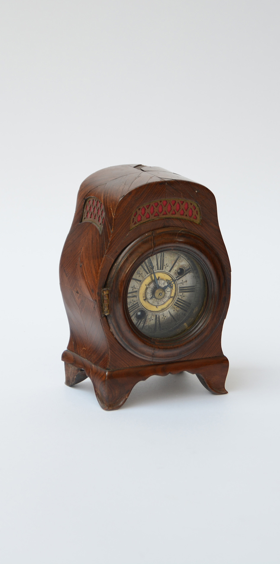 Orologio in metallo con quadrante a fascia con numeri romani, movimento a carica manuale scappamento a verga. In cassa lastronata in palissandro non pertinente. Fine sec. XVIII