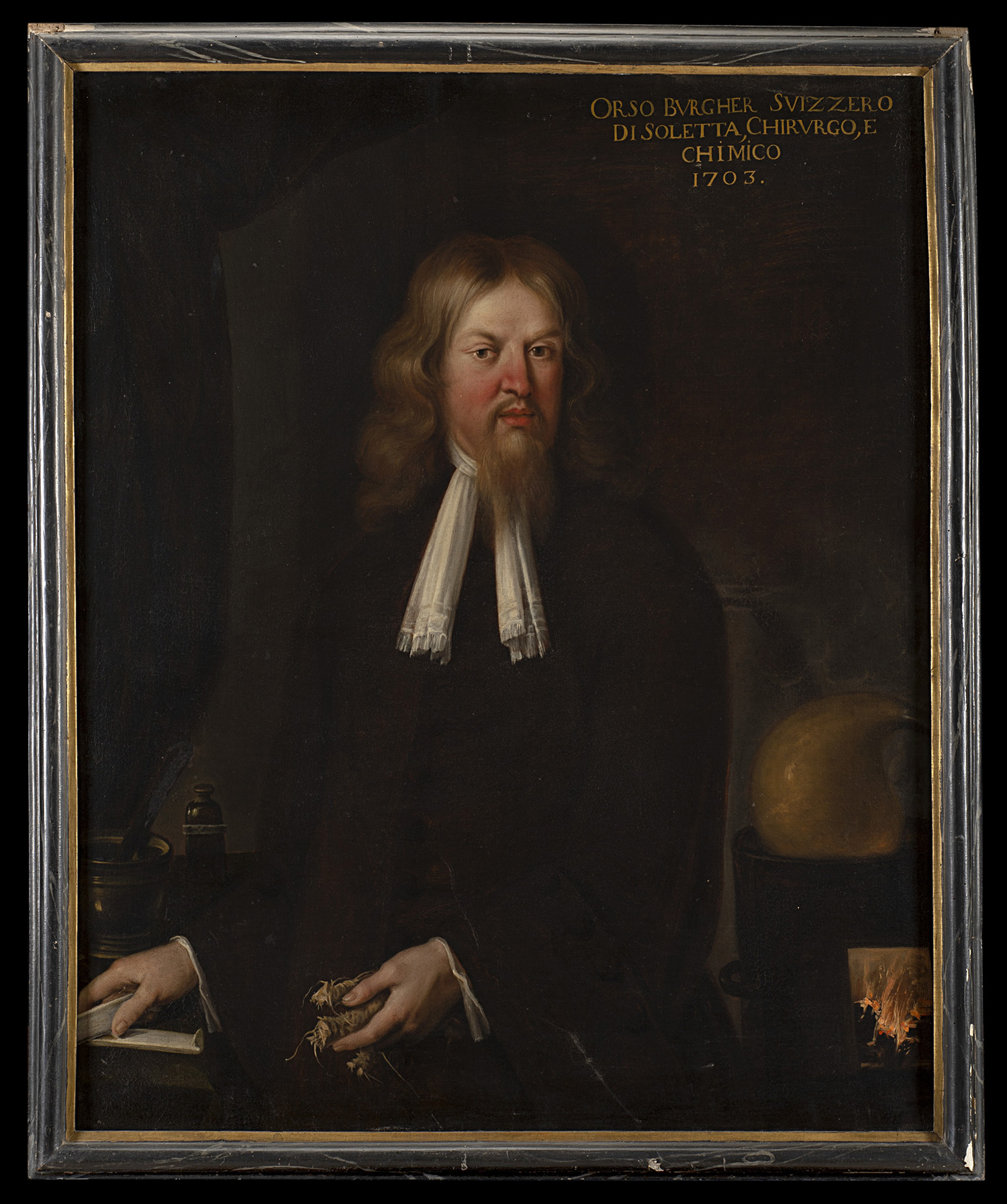 Iscritto in alto a destra "ORSO BURGHER SVIZZERO / DI SOLETTA, CHIRURGO, E / CHIMICO / 1703"
