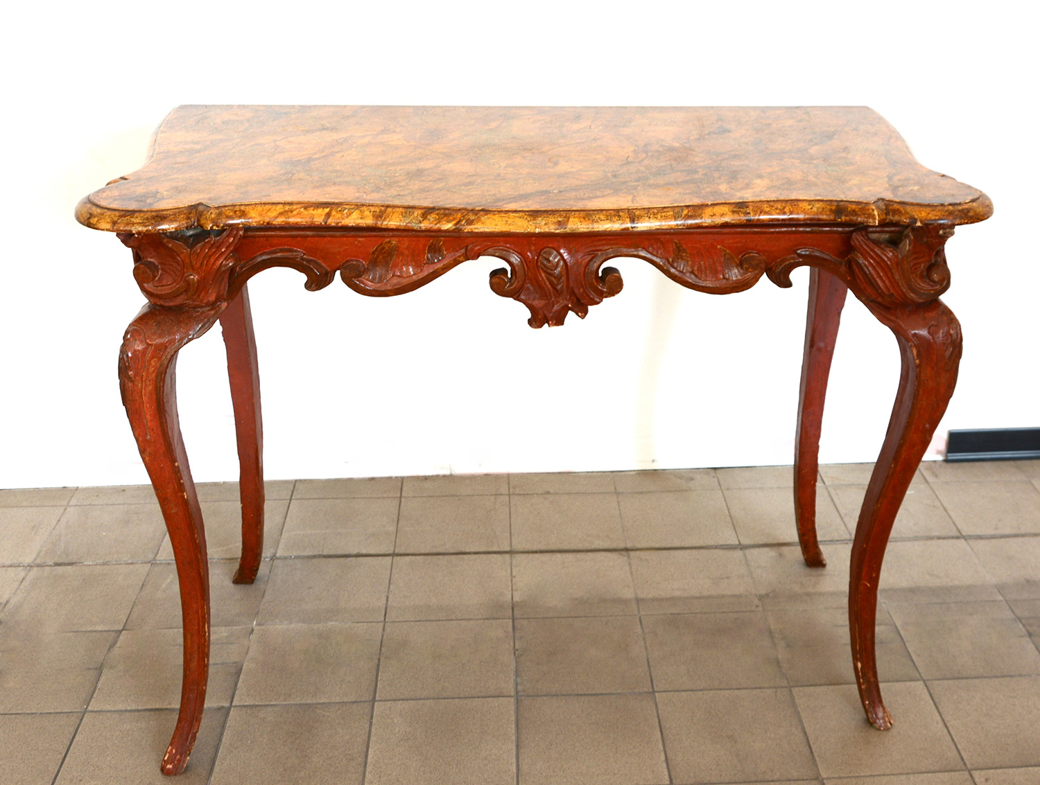 Antica consolle in legno laccato rosso con piano decorato a finto marmo. Gambe e fasce mosse (cm 105x67x60) (difetti)