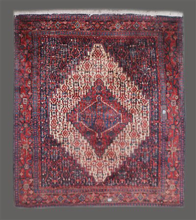 Tappeto Senneh, Persia, Decoro con medaglione romboidale rosso su fondo cammel