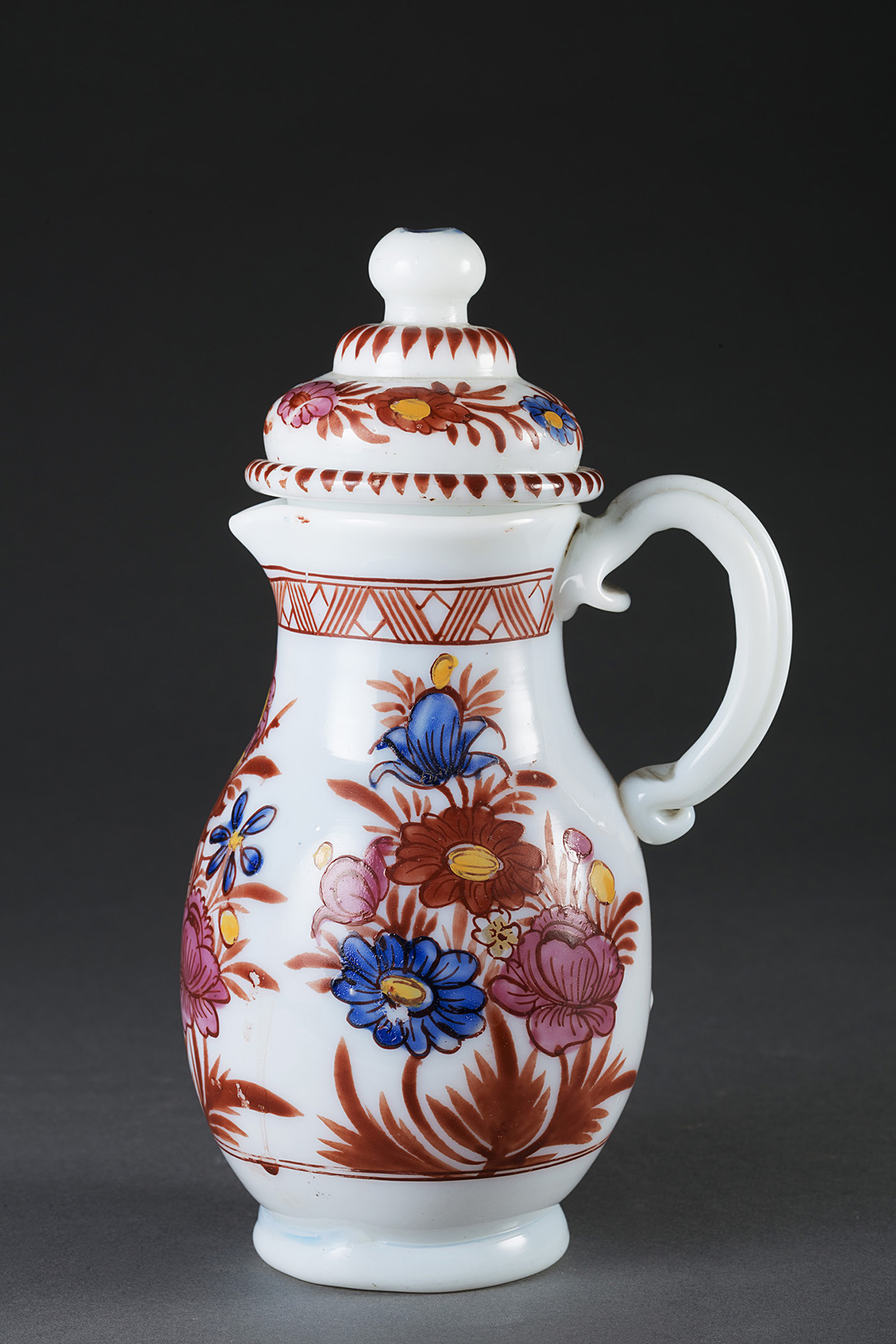 Piccola caffettiera con coperchio in vetro lattimo. Corpo piriforme e coperchio ‘alla persiana’. Decorazione a fiori in rosso ferro e blu di gusto orientale. Veneto, sec. XIX (h. cm 16) (lievi difetti)