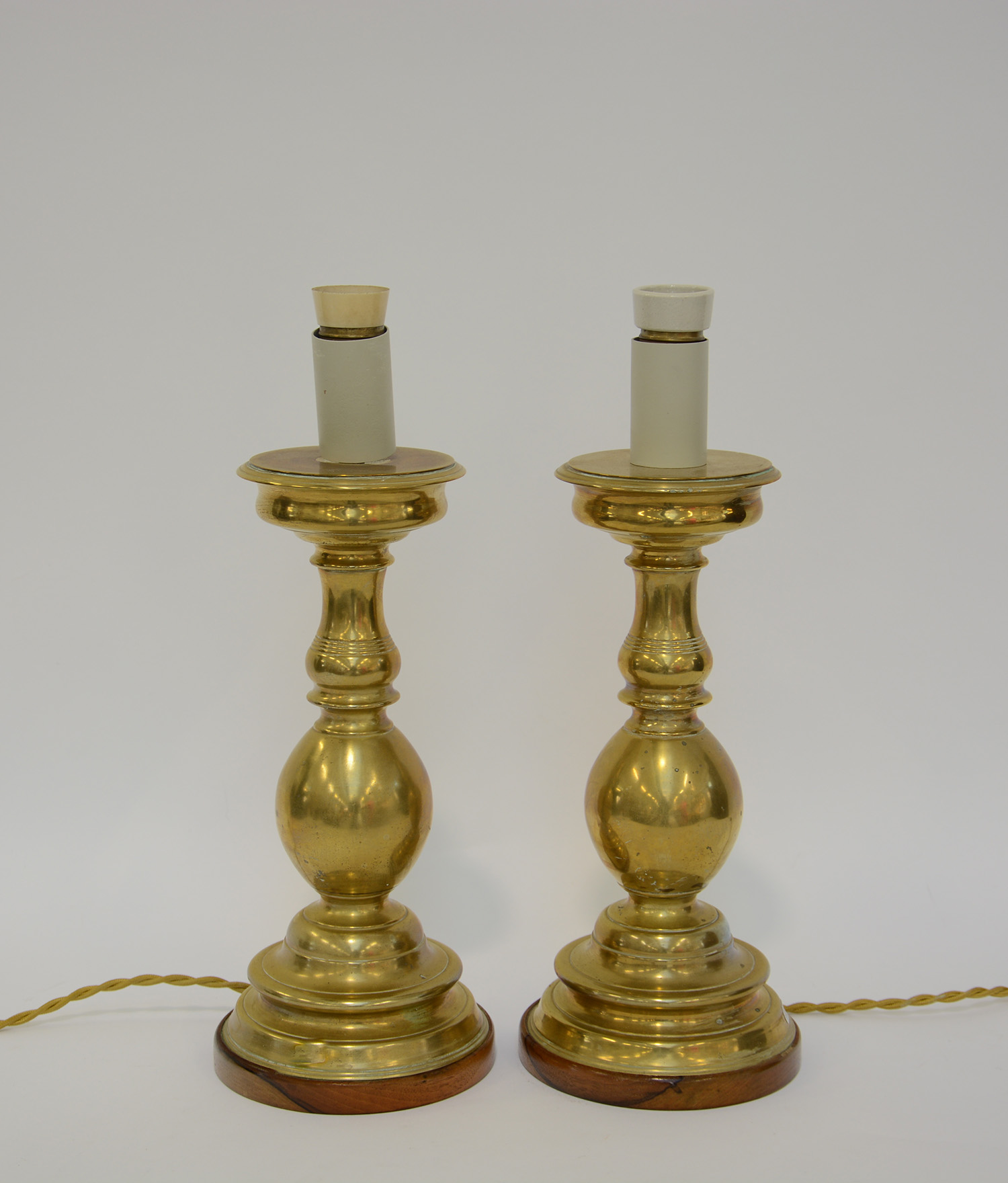 Coppia di candelieri in ottone tornito montati a luce elettrica (h cm 31)