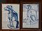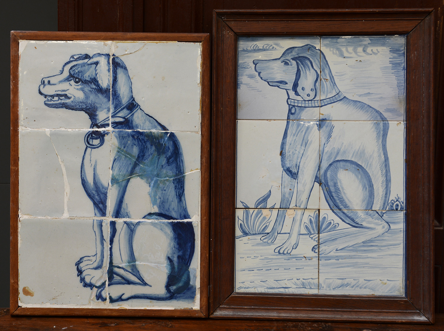 Lotto composto da due pannelli con piastrelle in ceramica decorate nei toni del blu raffiguranti cani, misure diverse. In cornici (difetti e restauri)