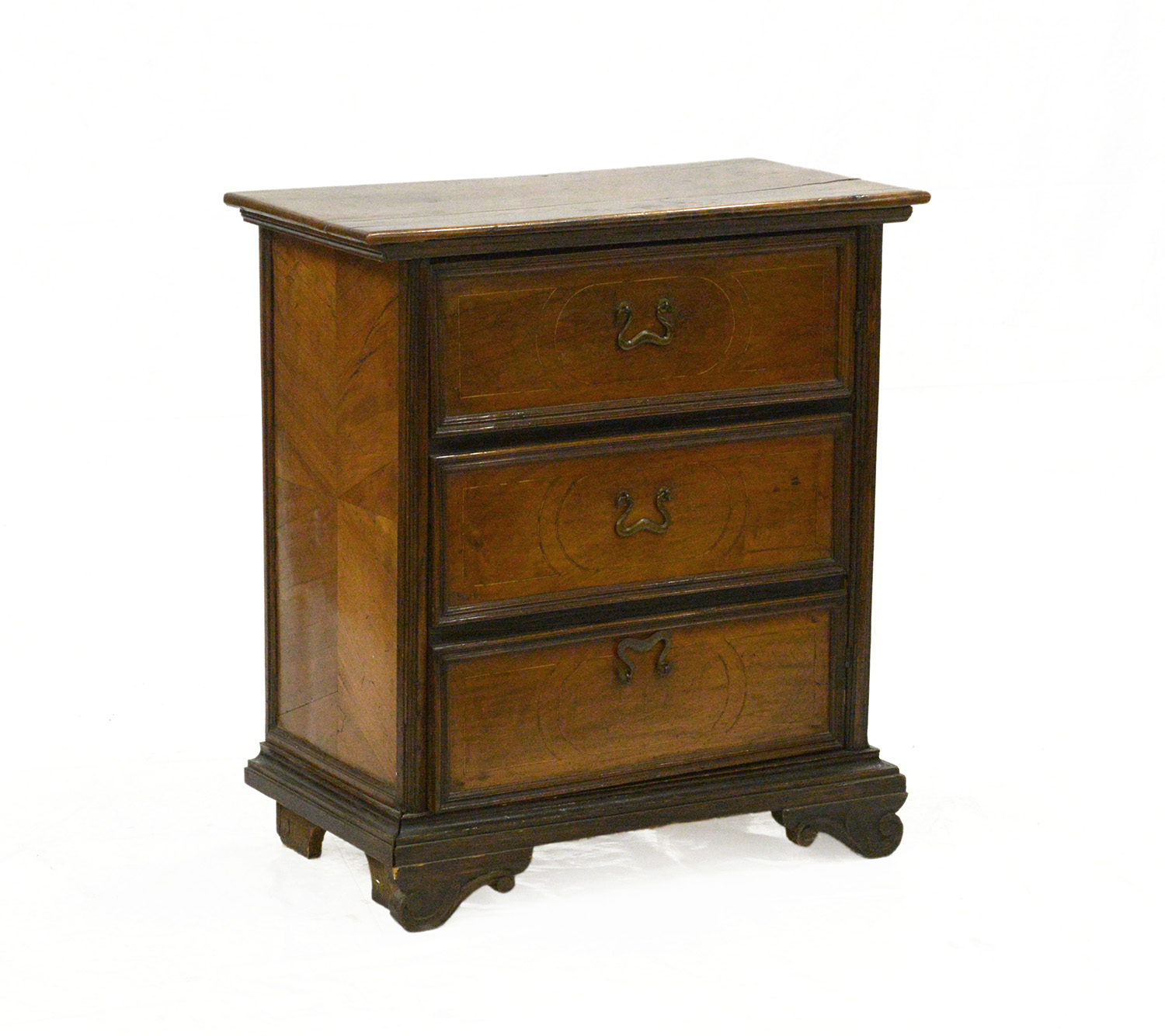 Antico mobile in noce con sportello centrale a finti cassetti filettati, piedi