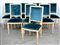 Gruppo di otto sedie con schienale squadrato in legno laccato bianco con gambe a colonna scanalata. Rivestite in tessuto blu (difetti)