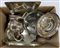 Cartone contenente numerosi oggetti per la tavola in metallo argentato (difetti