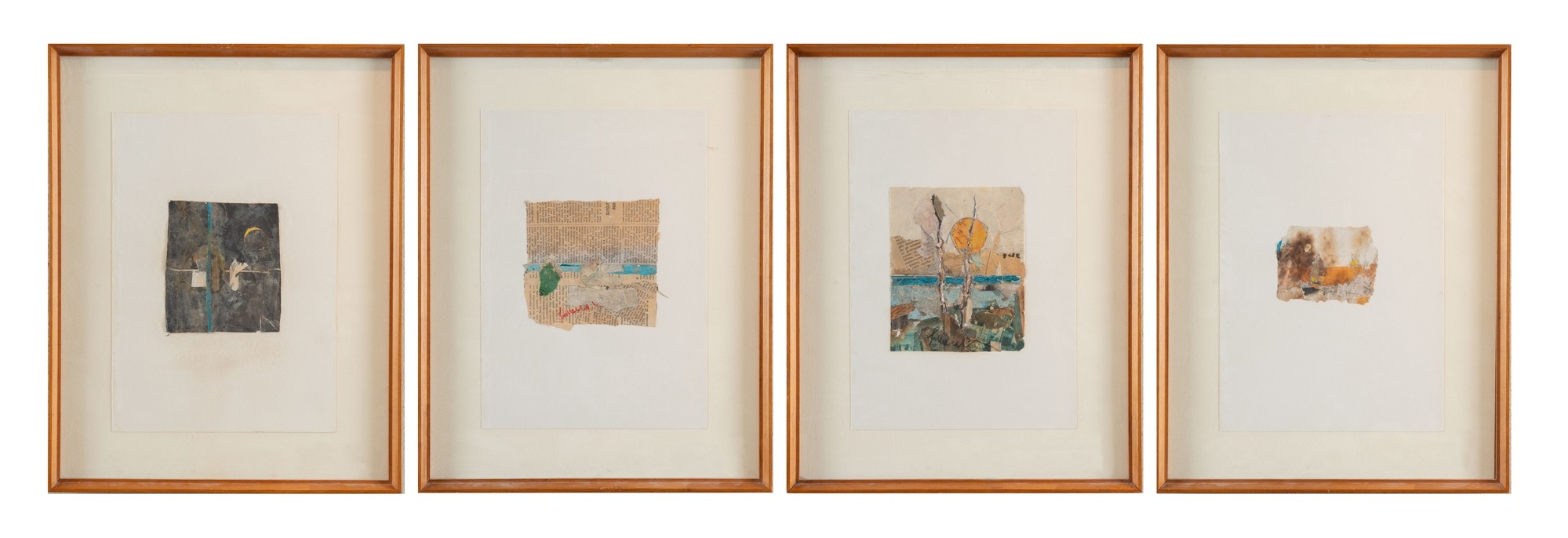 TONINO GOTTARELLI (Imola 1920 – 2007). Lotto composto da libro d’artista “LA BOTTE DI DIOGENE” e da quattro tecniche miste a collage firmate dall’artista. Cm 34x24 cad.