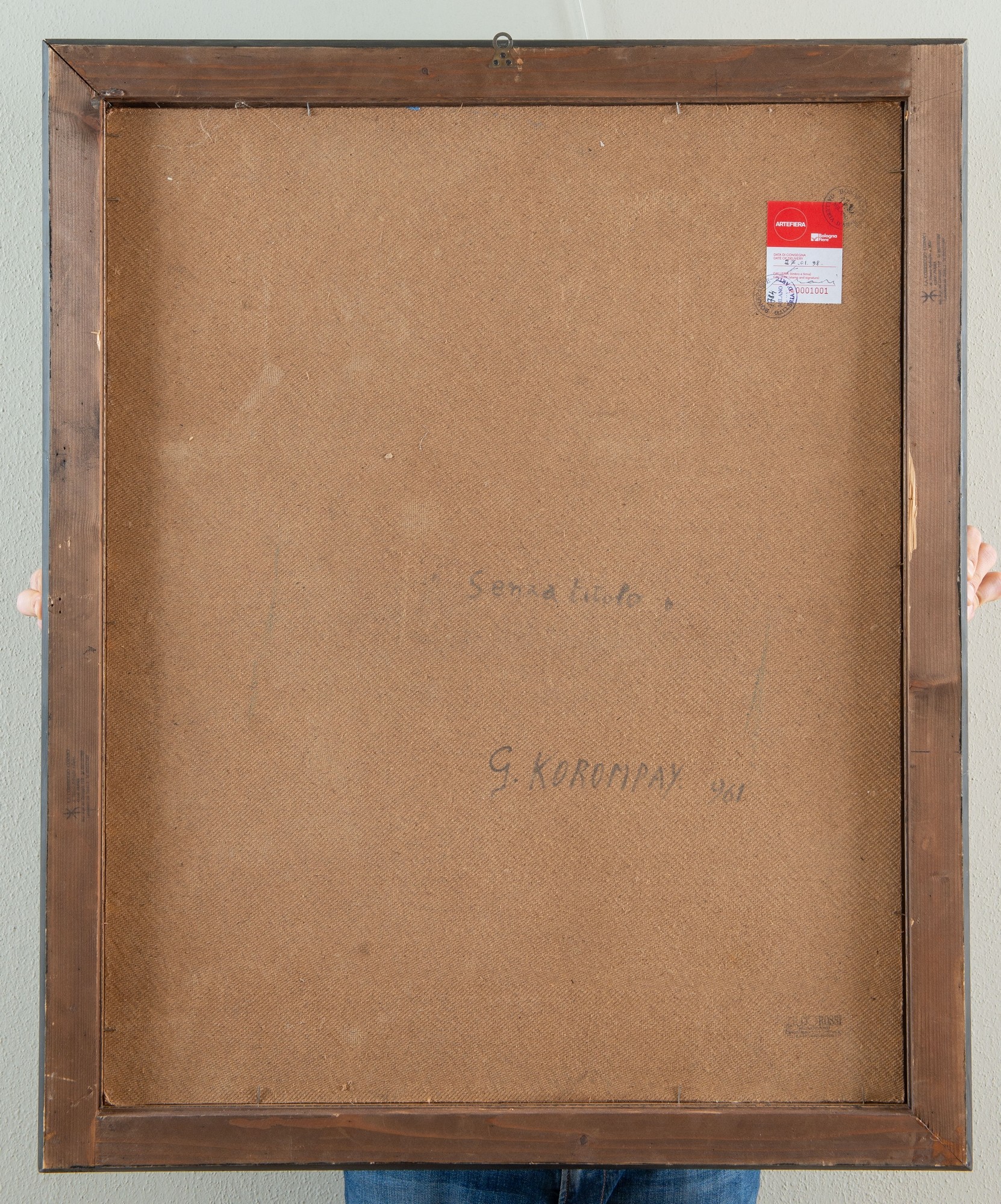 GIOVANNI KOROMPAY (Venezia 1904 – Rovereto 1988). “Senza titolo”, 1961. Olio su faesite. Cm 79x63. Opera firmata e datata in basso a destra “G.Korompay - 61”. Al retro opera intitolata, firmata e datata “Senza titolo G.Korompay. 961”. Reca al retro etichetta Artefiera Bologna 1998 con timbri della galleria d’arte Bonaparte Milano con numeri di archivio 1784. Opera accompagnata da autentica su fotografia.
