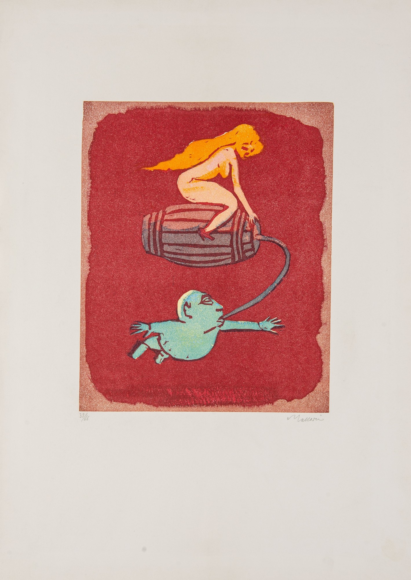 MINO MACCARI (Siena 1898 – 1989). “Senza titolo”. Litografia a colori su carta. Foglio: cm 70x50,5. Opera firmata in basso a destra Maccari, numeri di tiratura in basso a sinistra 35/66.