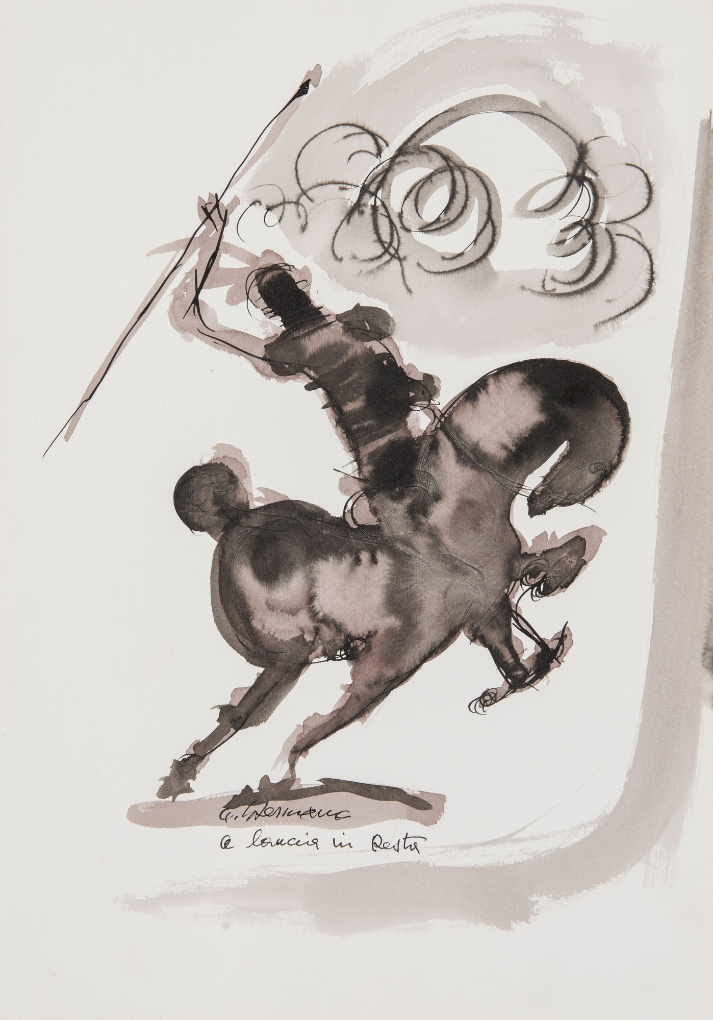 QUINTO GHERMANDI (Crevalcore 1916 – San Lazzaro di Savena 1994). “Cavaliere”. Acquerello su carta. Cm 50x35. Opera firmata in basso al centro Q.Ghermandi.