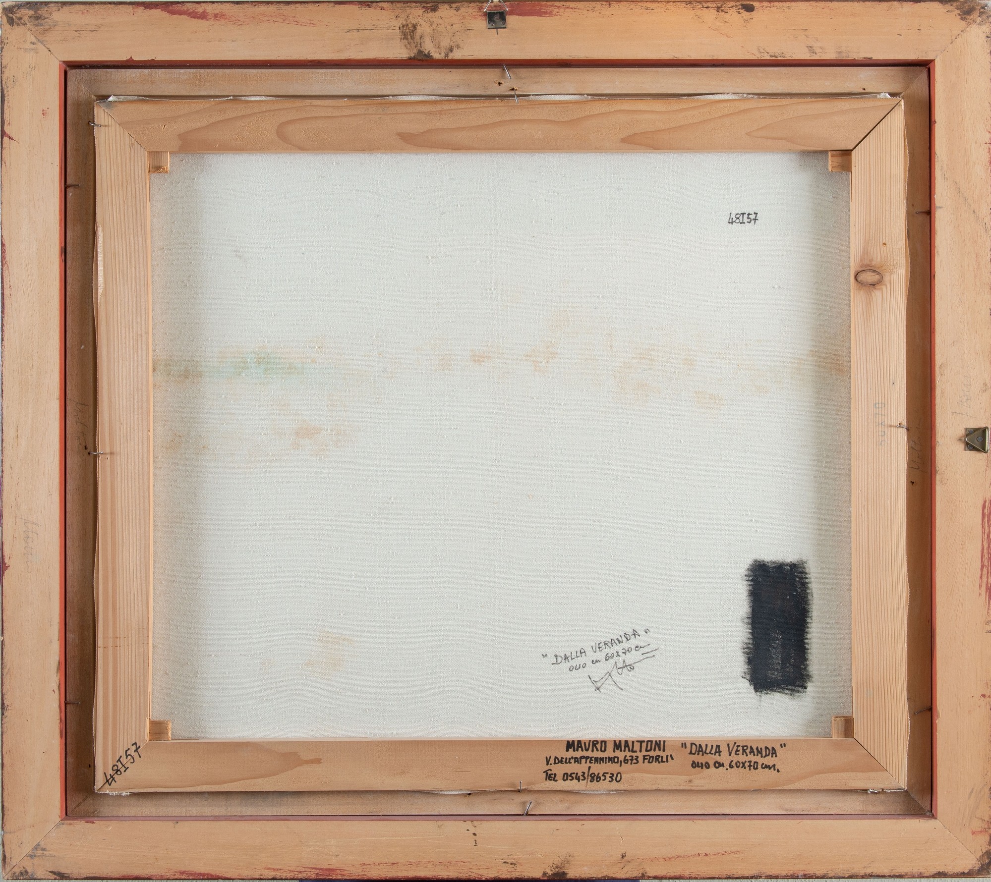 MAURO MALTONI (Forlì 1946). "Dalla veranda". Olio su tela. Cm 60x70. Opera firmata in basso a destra Maltoni. Al retro opera firmata e intitolata Maltoni Dalla Veranda.