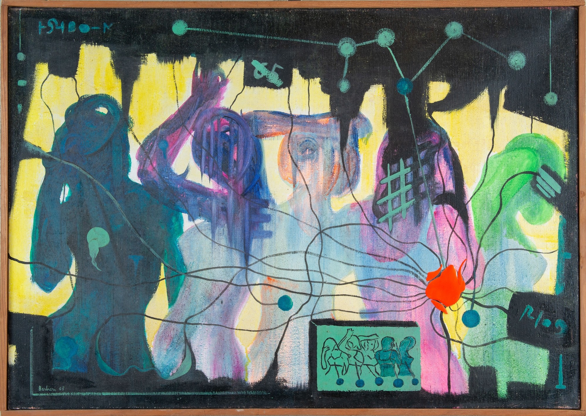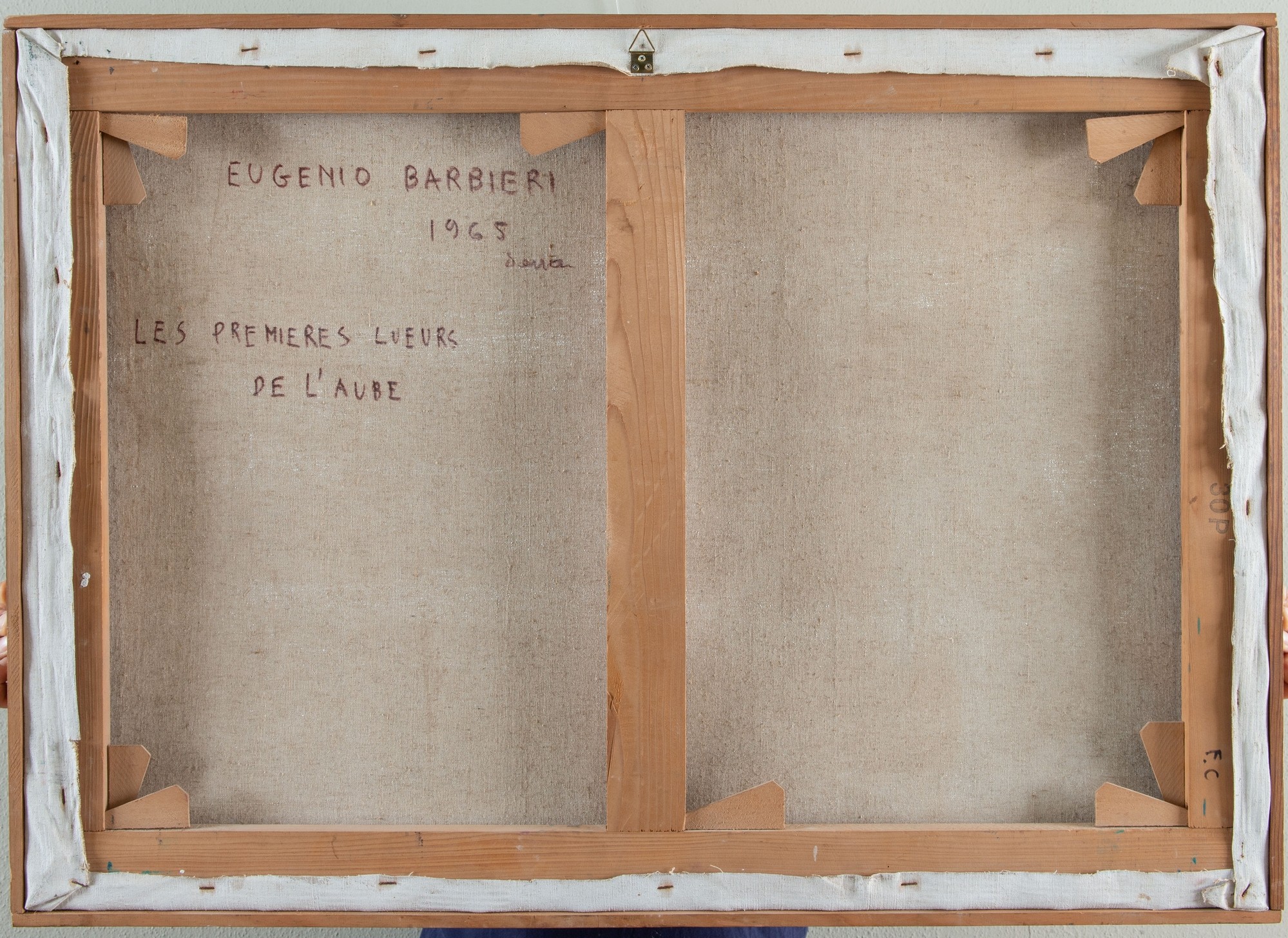 EUGENIO BARBIERI (Forlì 1927 - 2015). "Les premières lueurs de l'aube", 1965. Olio su tela. Cm 65x93. Opera firmata e datata in basso a sinistra Barbieri - 65. Al retro opera firmata, datata e intitolata Eugenio Barbieri - 1965 - Les premieres lueurs de l'aube.