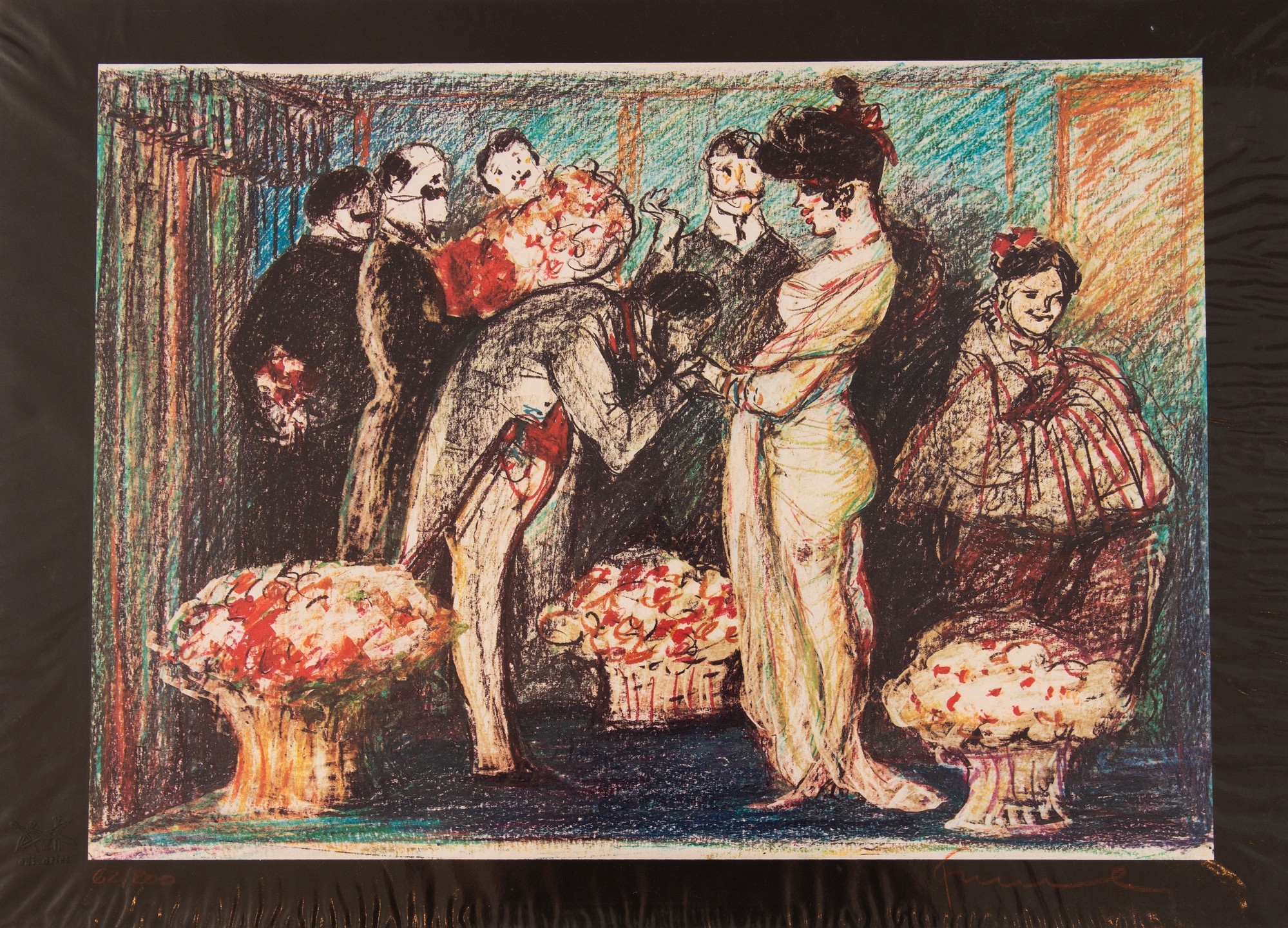 SALVATORE FIUME (Comiso 1915 – Canzo 1997). “La serata della diva”. Litografia a colori su carta. Foglio: cm 49,8x69,8. Opera firmata in basso a destra Fiume e con numero di tiratura in basso a sinistra 108/200. Dalla raccolta di otto novelle di Giovanni Verga dal maestro.