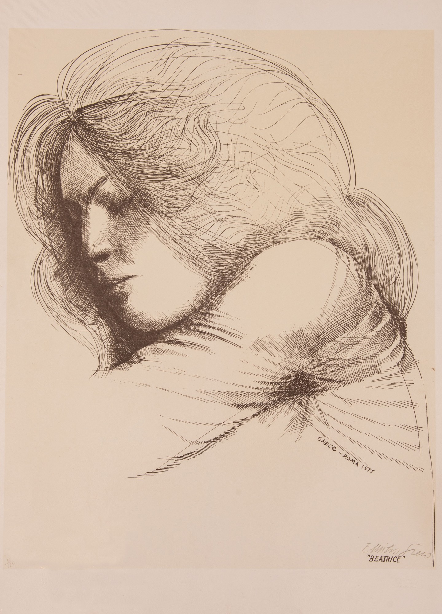 EMILIO GRECO (Catania 1913 – Roma 1995). “Beatrice”, 1977. Litografia su carta. Foglio: cm 70x50. Opera firmata, datata e intitolata in basso a destra Greco – Roma 1977 – Beatrice e con numeri di tiratura in basso a sinistra 69/125. In basso a sinistra reca stampo Trec – edizioni pregiate.