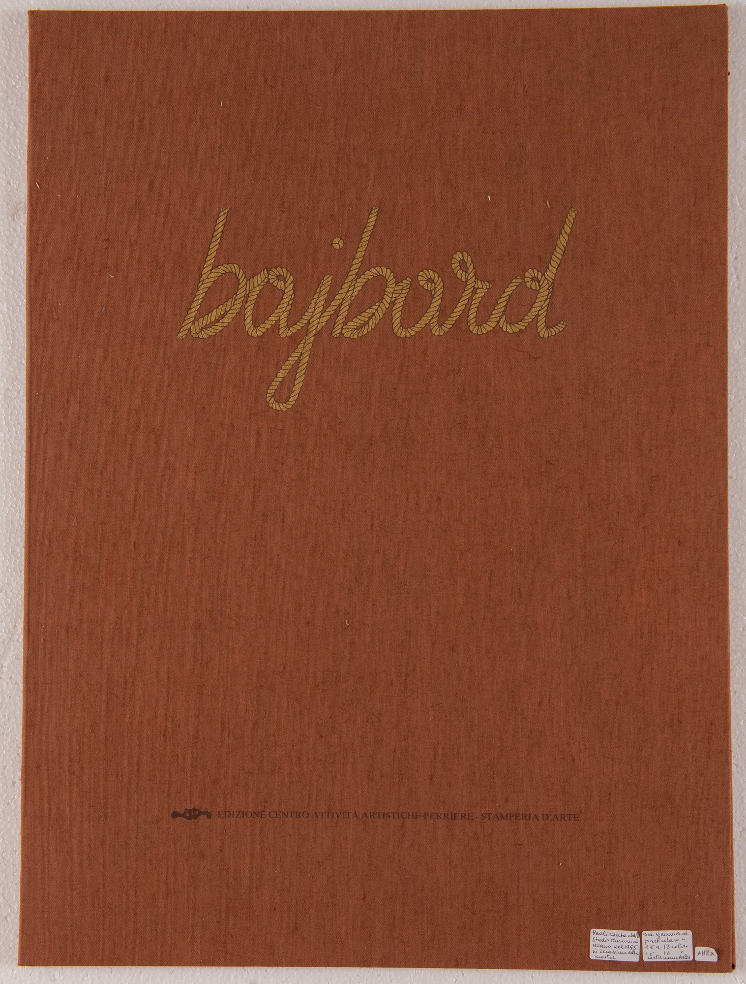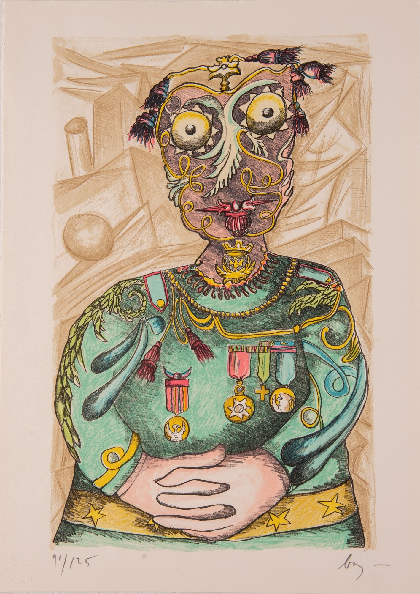 ENRICO BAJ (Milano 1924 – Vergiate 2003). Cartella contenente litografia a colori su carta, 1985. Foglio: cm 70x50. Litografia realizzata In occasione della mostra di Enrico Baj “Dal generale al particolare”, allestita al Forte di Bard, nell’estate del 1985. Opera firmata in basso a destra Baj e con numeri di tiratura in basso a sinistra 91/125. Reca in basso a sinistra timbro della stamperia Perriere.