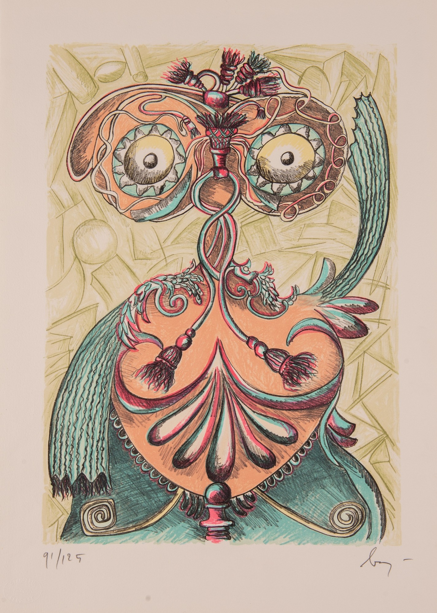 ENRICO BAJ (Milano 1924 – Vergiate 2003). Cartella contenente litografia a colori su carta, 1985. Foglio: cm 70x50. . Litografia realizzata In occasione della mostra di Enrico Baj “Dal generale al particolare”, allestita al Forte di Bard, nell’estate del 1985. Opera firmata in basso a destra Baj e con numeri di tiratura in basso a sinistra 91/125. Reca in basso a sinistra timbro della stamperia Perriere.