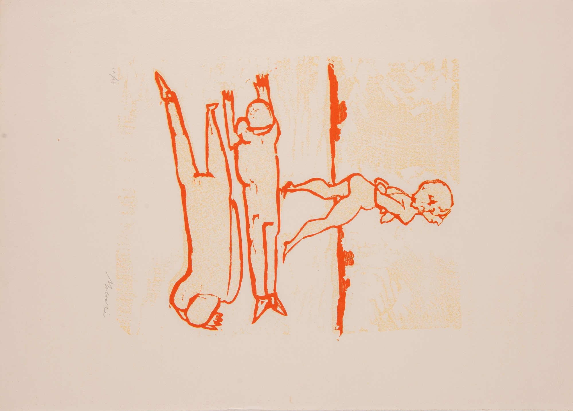 MINO MACCARI (Siena 1898 - Roma 1989). “Figure”. Litografia a colori su carta. Cm 70x50. Opera firmata in basso a destra Maccari e con numeri di tiratura in basso a sinistra 22/48.