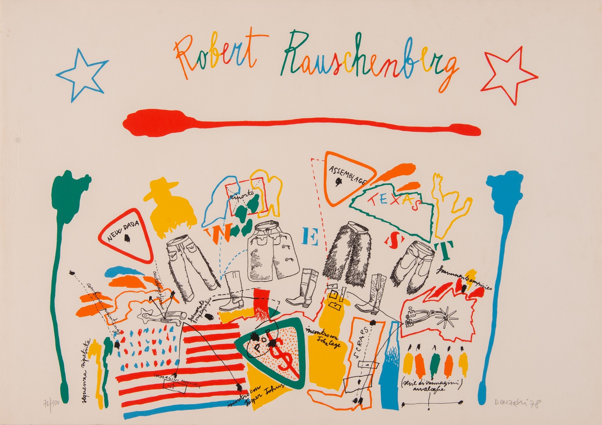 BRUNO DONZELLI (Napoli 1941). “Robert Rauschenberg”, 1978. Litografia a colori su carta. Cm 49,5x70. Opera firmata e datata in basso a destra Donzelli ’78 e con numeri di tiratura in basso a sinistra 72/100.