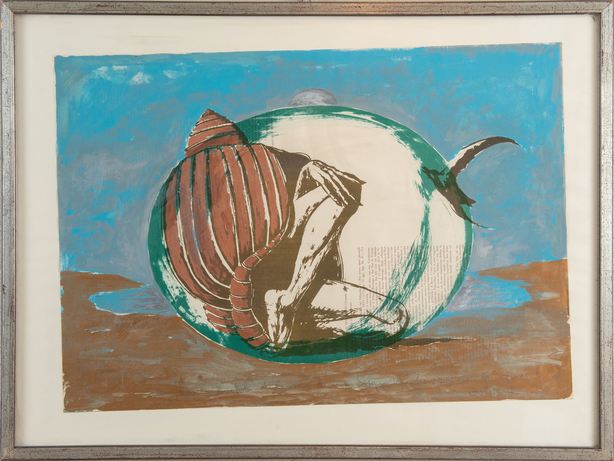 SERGIO VACCHI (Castenaso 1925 - Siena 2016). "Senza titolo", 1976. Tecnica mista su carta. Cm 50x70,5. Opera firmata e datata in basso a destra "Sergio Vacchi 1976, Bologna". Opera dedicata in basso al centro. Provenienza: opera donata dall'artista all'attuale proprietà.