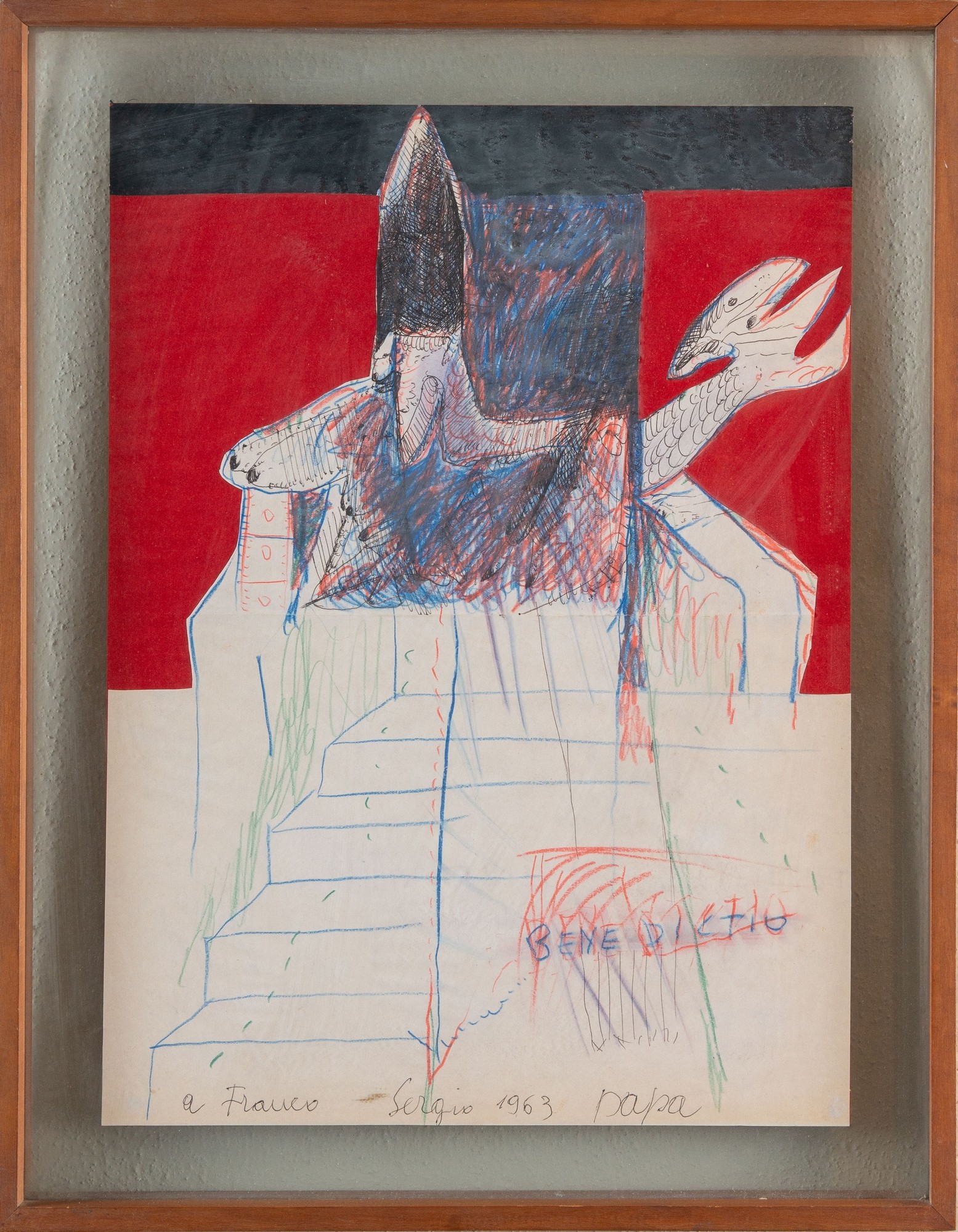 SERGIO VACCHI (Castenaso 1925 - Siena 2016). "Papa Benedictio", 1963. Tecnica mista e collage su carta. Cm 41,5x30,5. opera firmata e datata in basso a destra "Sergio 1963".