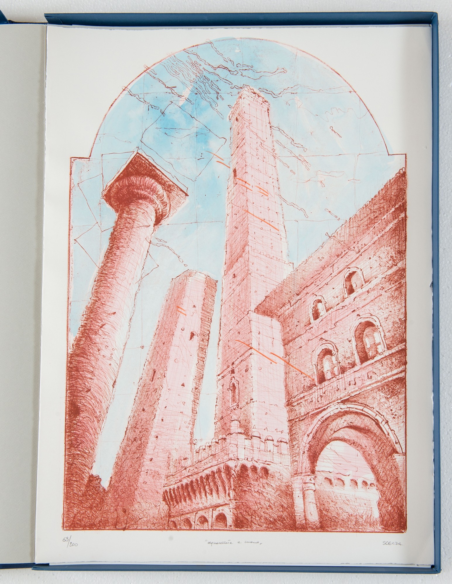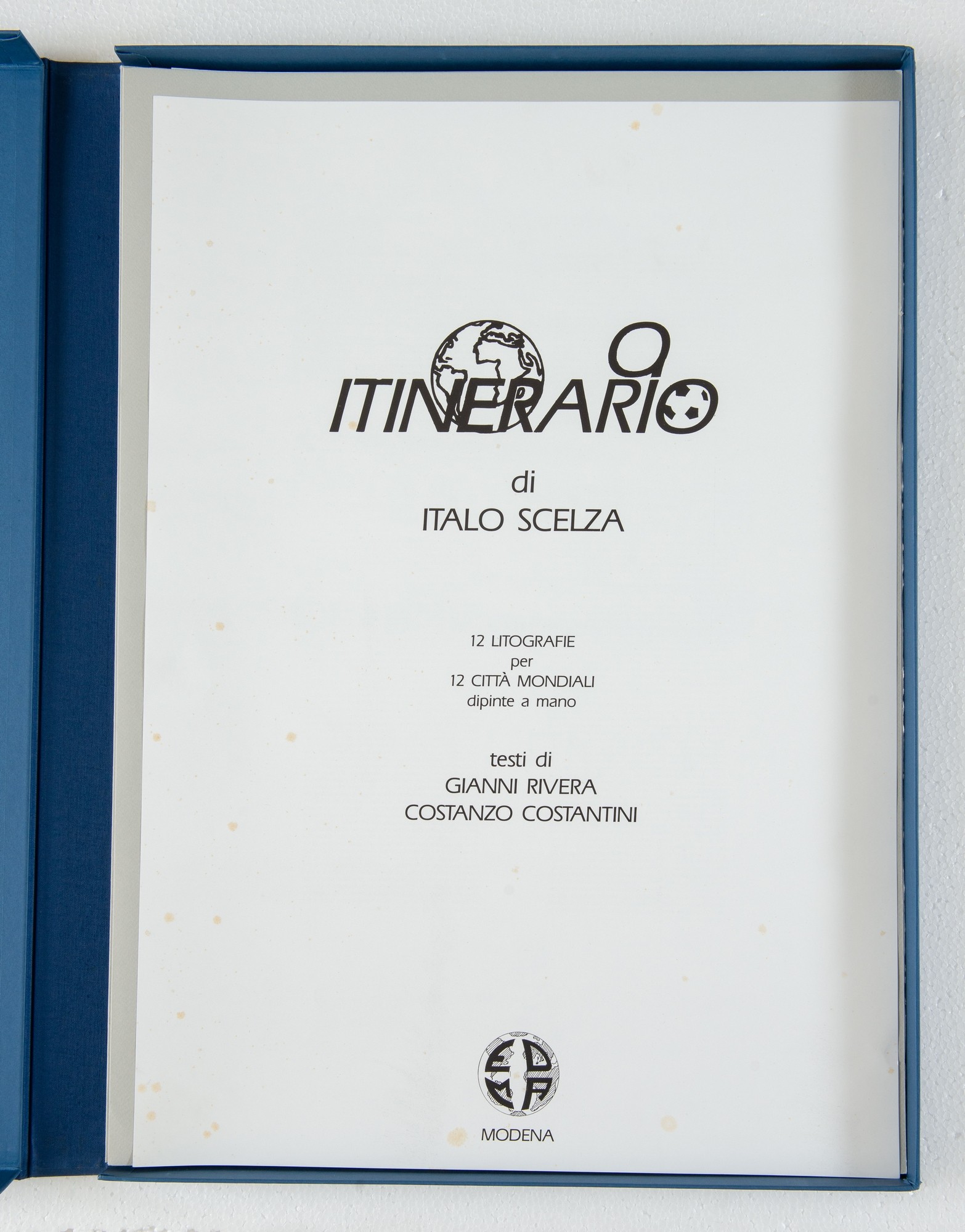 ITALO SCELZA. "Itinerario". Edizione d'arte contenente dodici litografie per dodici dittà mondiali dipinte a mano dall'artista. L'edizione è contenuta entro cofanetto originale di cm 73x51,5. Tutte le litografie recano firma, titolo e numero di tiratura. Ed. EDMA - Modena.