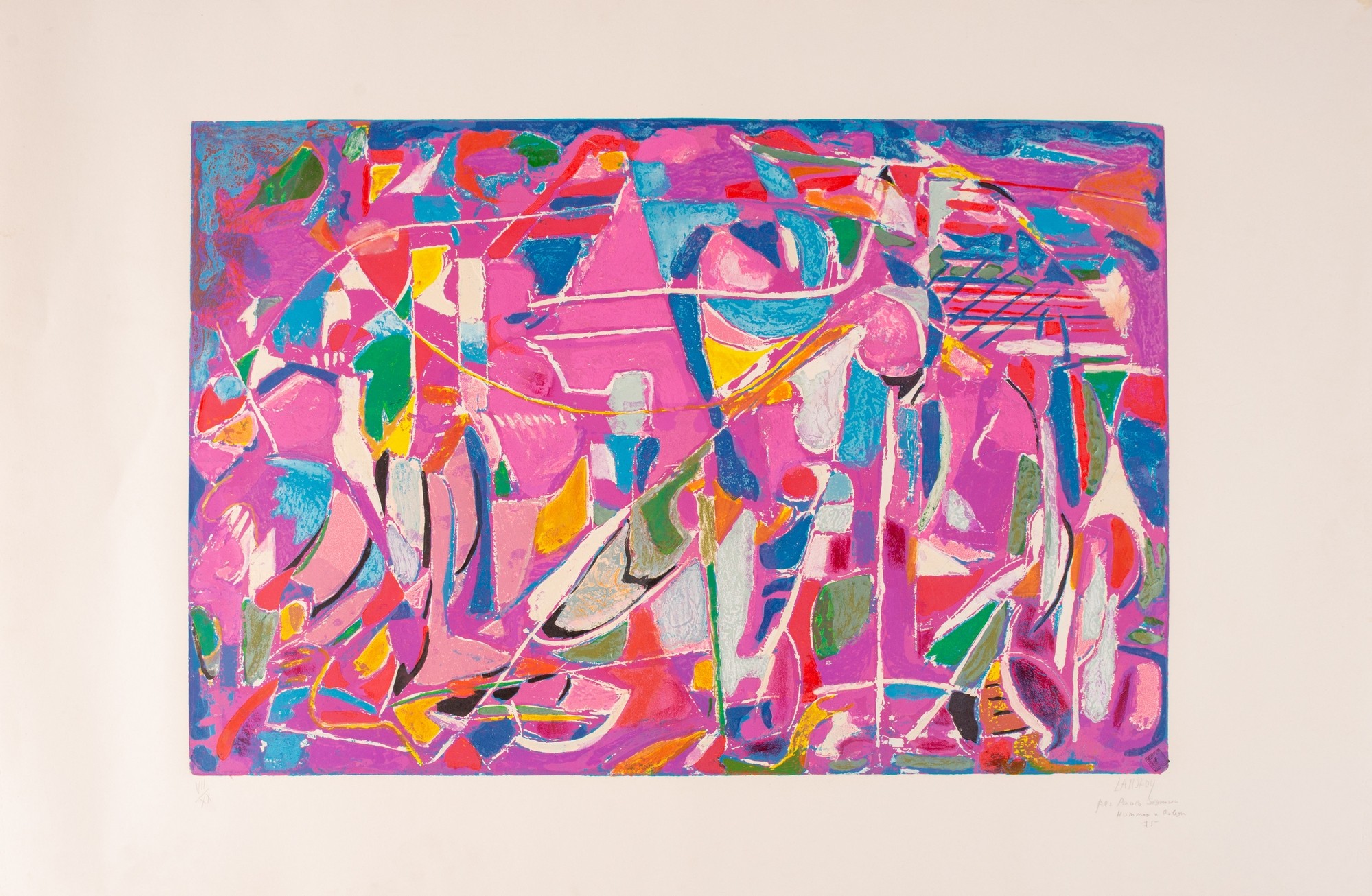 ANDRE' LANSKOY (Mosca 1902 - Parigi 1976). "Homage a Bologna". Litografia a colori su carta. Cm 89x106. Opera firmata, datata, intitolata e dedicata in basso a destra e con numeri di tiratura in basso a sinistra VIII/XX. In basso a destra reca timbro "Autentica litografia Pietra Bavarese".