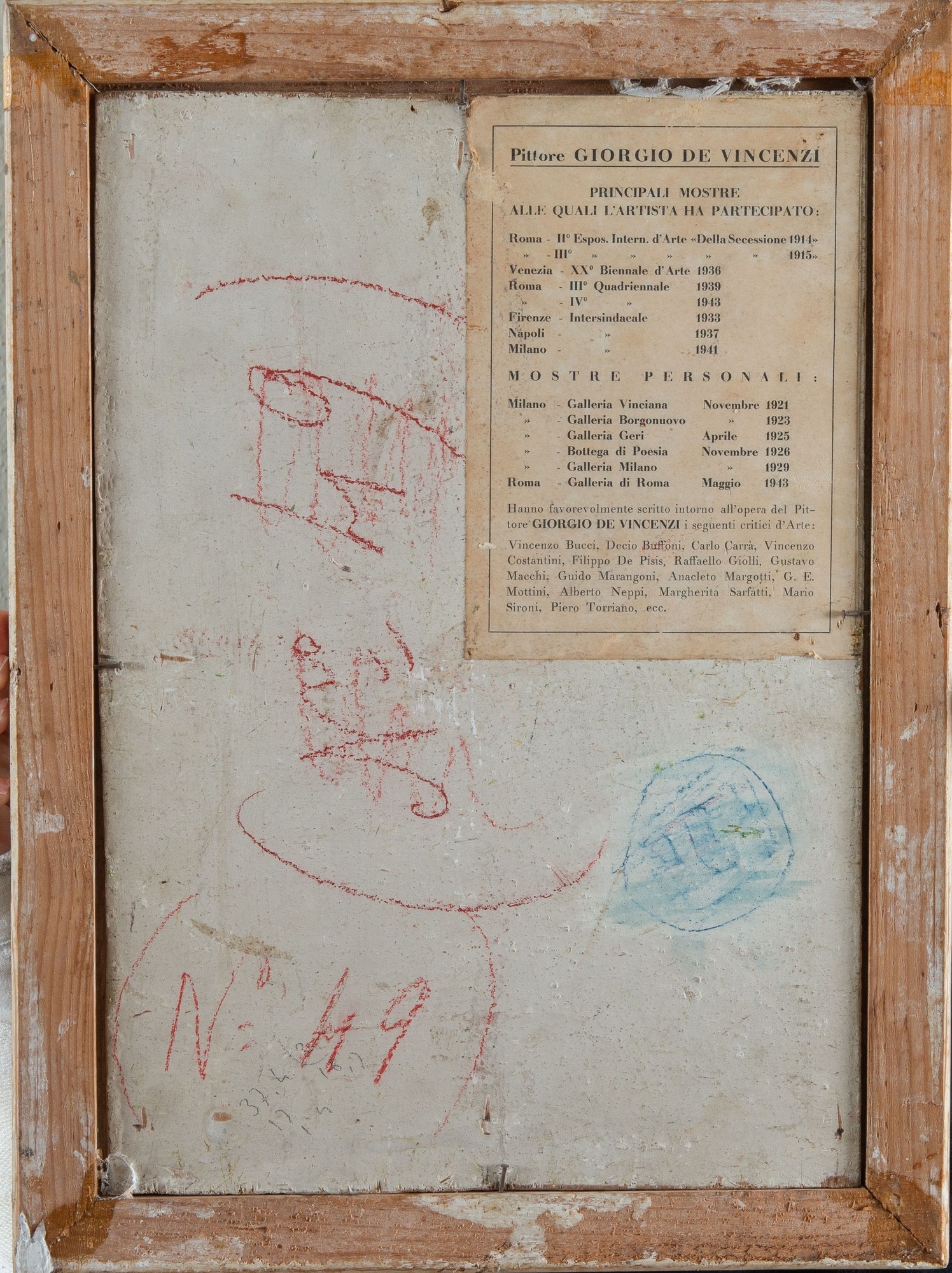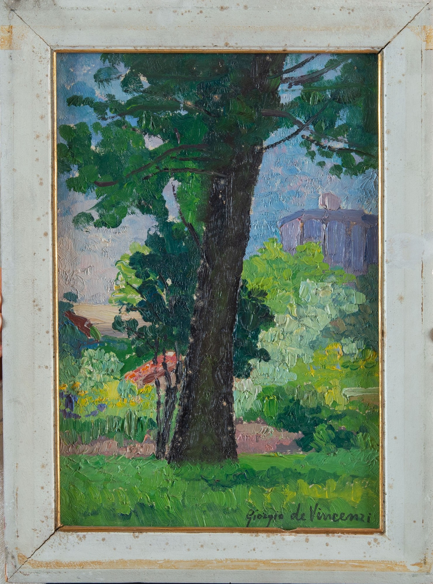 GIORGIO DE VINCENZI (Ferrara 1884 - Bologna 1965). "Paesaggio". Olio su tavola. Cm 32,5x22,5. Opera firmata in basso a destra Giorgio de Vincenzi. Al retro reca etichetta citante le mostre in cui l'opera compare.