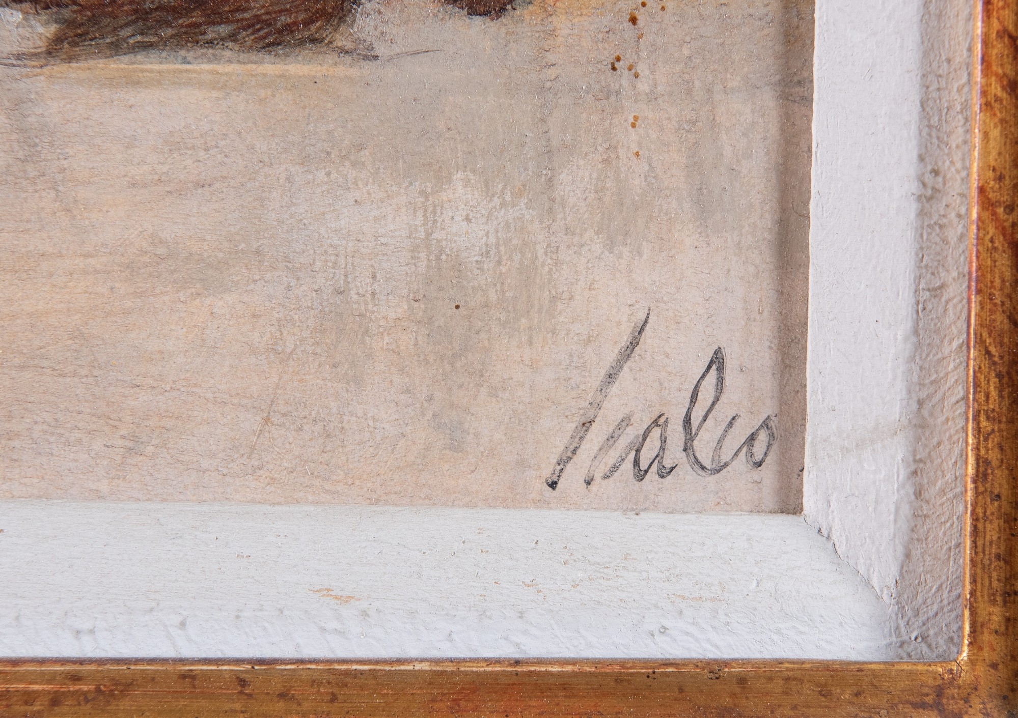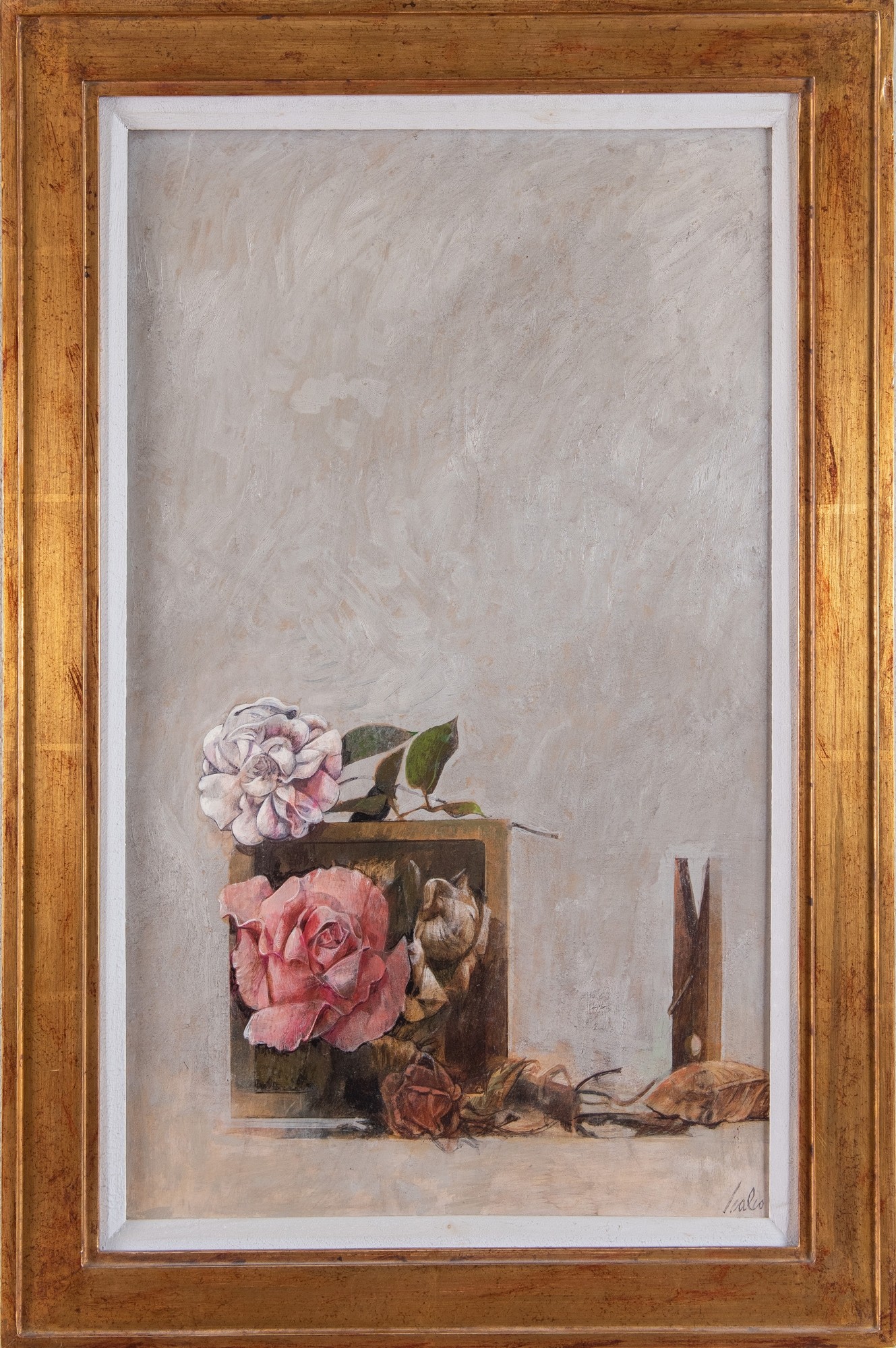 GIORGIO SCALCO (Schio 1929). “Camelie”, 1990. Olio su cartone. H. Cm 70x43. Opera firmata in basso a destra “Scalco”. Opera firmata, datata e intitolata al retro “Scalco ’90 ‘Camelie'”. Opera accompagnata da fotografia con timbro parzialmente leggibile di una galleria bolognese.