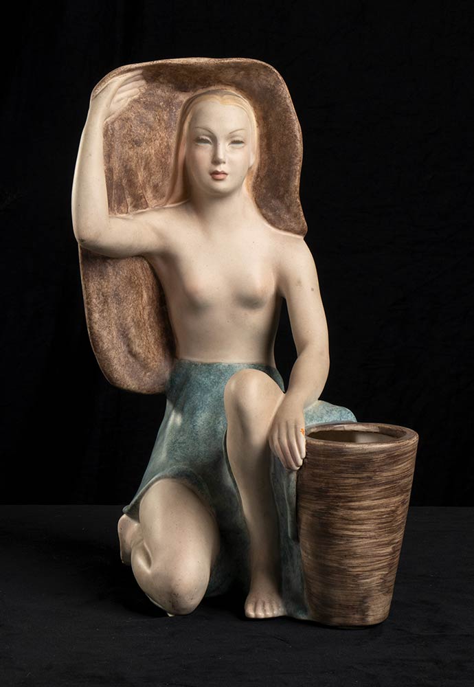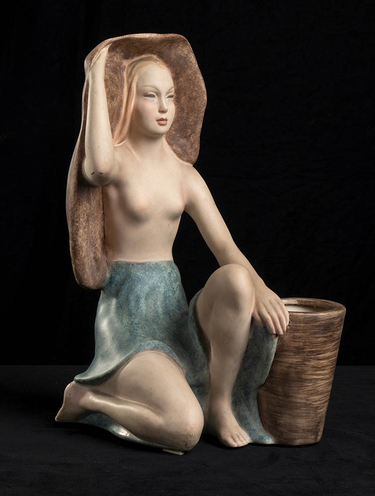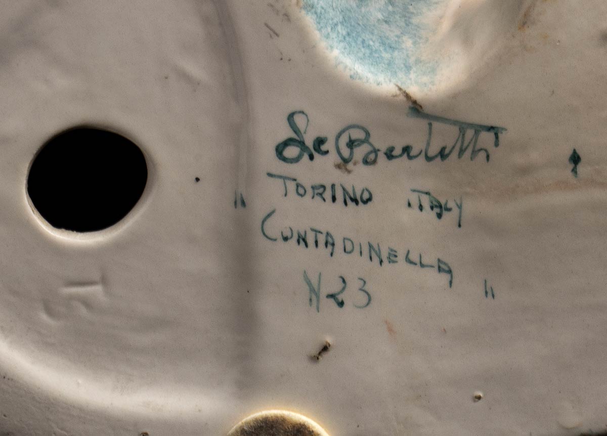 Opaque polychrome ceramic shaped as casting representing a crouched lady with a pannier. Marked "Le Bertetti, Torino Italy "Contadinella" nr. 23.